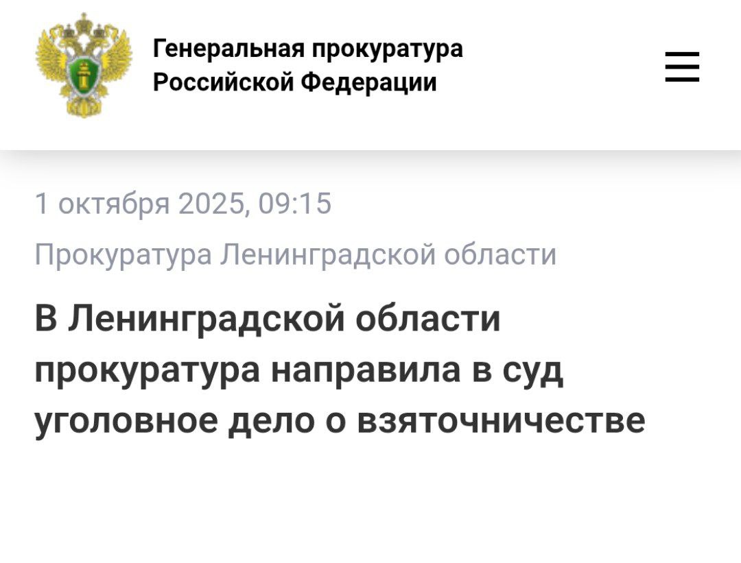 Прокуратура Ленинградской области утвердила обвинительное заключение по уголовному делу в отношении бывшего первого заместителя председателя Ленинградского областного Комитета по управлению государственным имуществом и Контрольного комитета губернатора Ленинградской области Олега Зинченко. Он обвиняется по ч. 6 ст. 290 УК РФ (получение взятки в особо крупном размере) и ч. 3 ст. 285 УК РФ (злоупотребление должностными полномочиями).