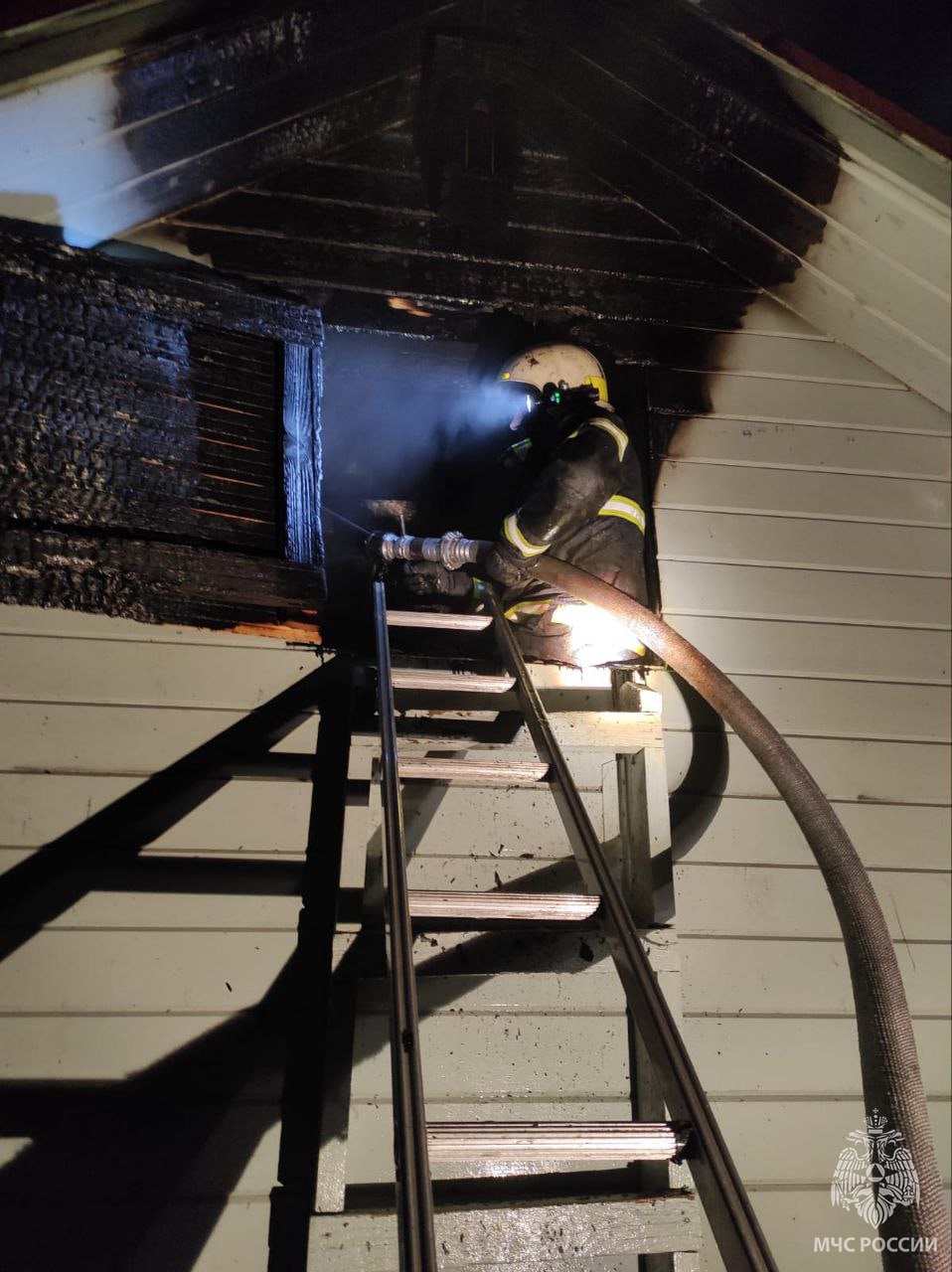 На место происшествия незамедлительно выехали пожарно-спасательные подразделения. В результате пожара в бане размером 4x9 метра огнём было повреждено чердачное помещение и межпотолочные перекрытия на общей площади 62 метра.