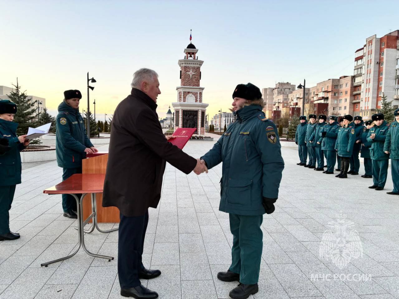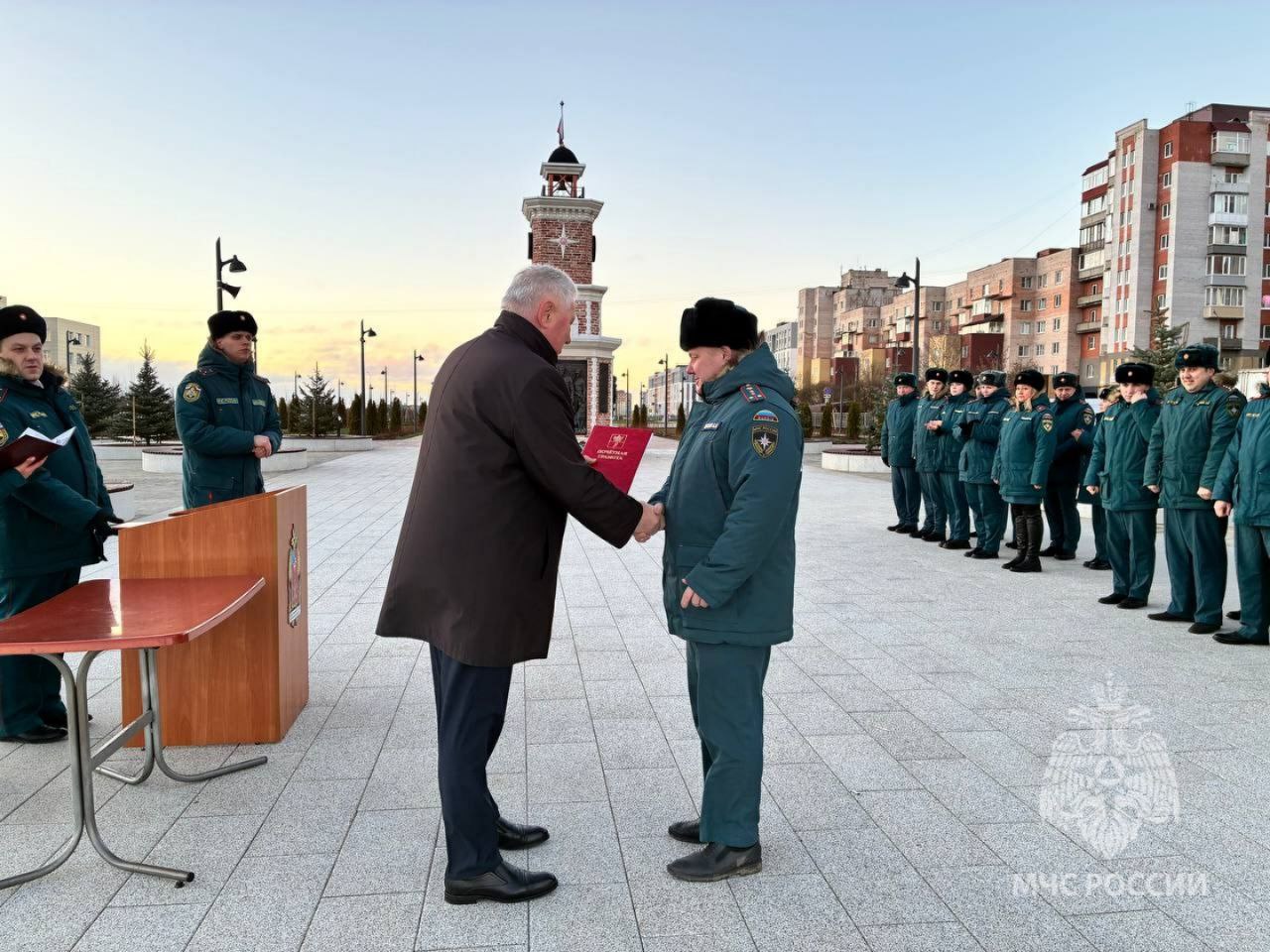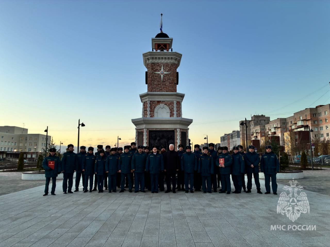 Местом проведения церемонии символично стал Сквер спасателей, где собрались ветераны службы и действующие сотрудники МЧС России.