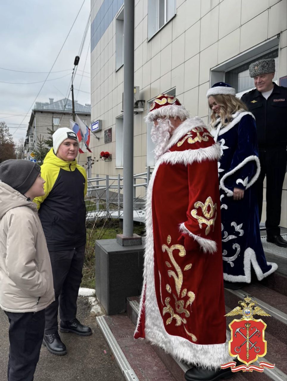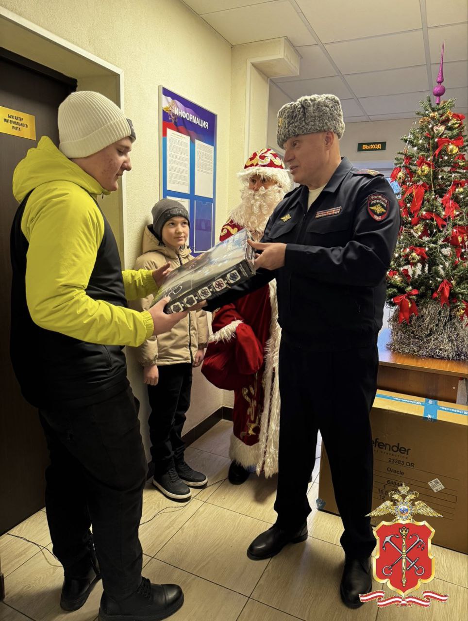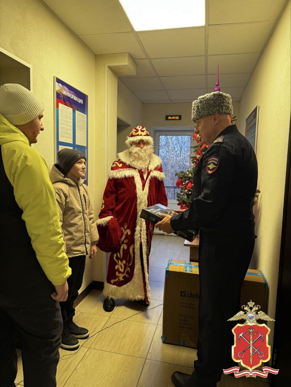 Максима и Кирилла пригласили в районный отдел полиции, где их вместе с Геннадием Рошка встретили настоящие полицейские Дед Мороз и Снегурочка, а также представители Совета ветеранов и Общественного совета при ОМВД России по Кировскому району Ленинградской области.