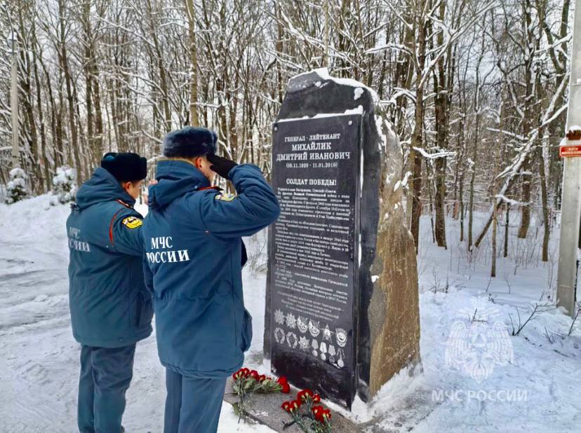 Мемориальная доска на памятном камне рассказывает о жизненном пути Дмитрия Ивановича, который является достойным примером служения Отчизне не только для своих детей, внуков и правнуков, но и для молодого поколения специалистов МЧС России.