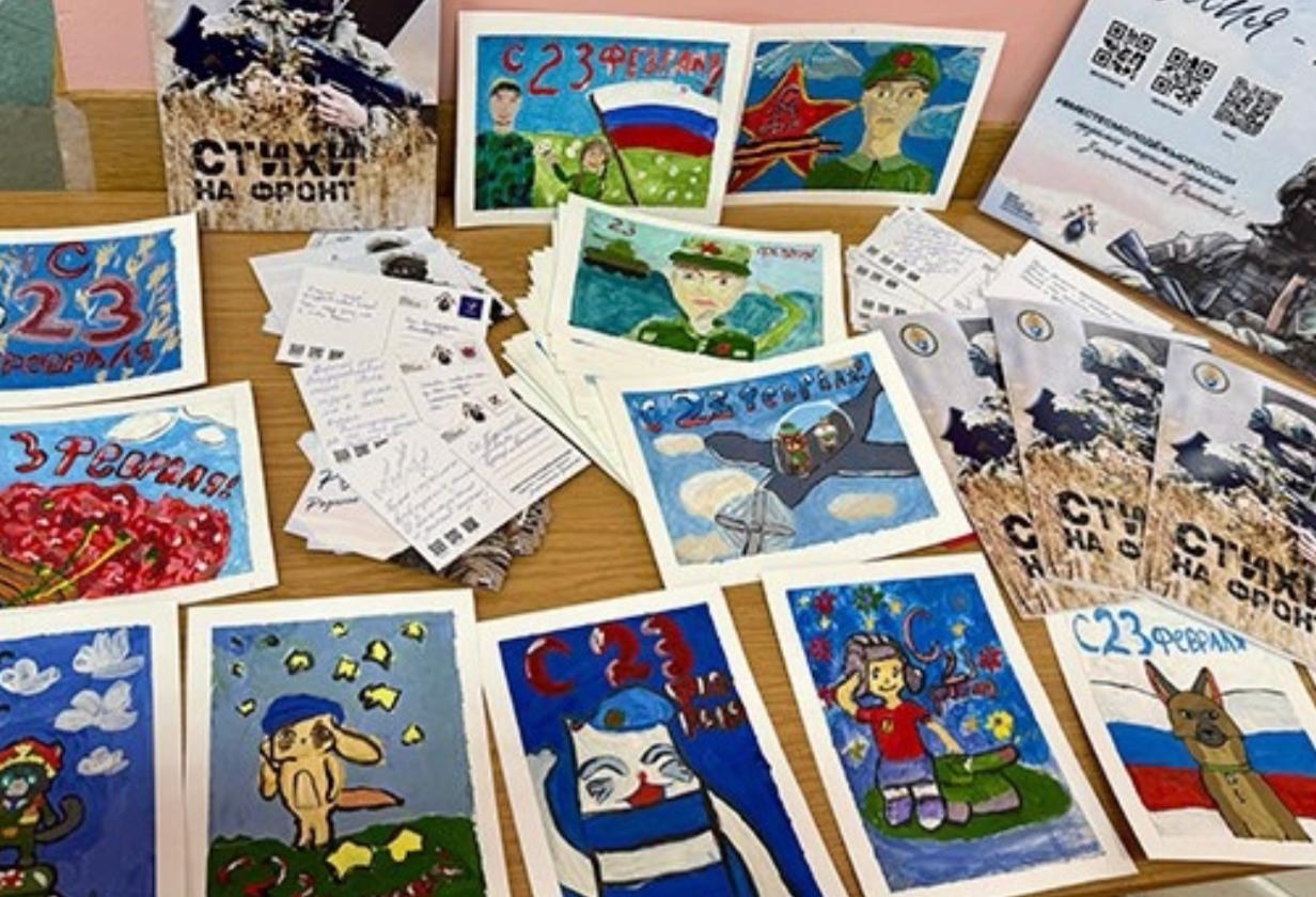 В завершение встречи бойцам передали открытки с поздравлениями, выполненные учениками А.О. Герасимовой – супруги погибшего в зоне СВО Героя России Вадима Сергеевича Герасимова. На каждой открытке дети изобразили трогательные рисунки и написали слова поддержки с пожеланиями скорейшего выздоровления и возвращения домой.