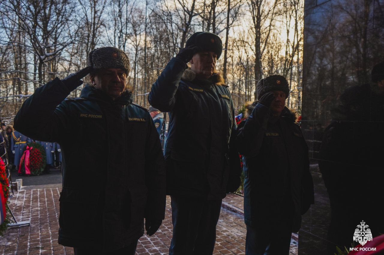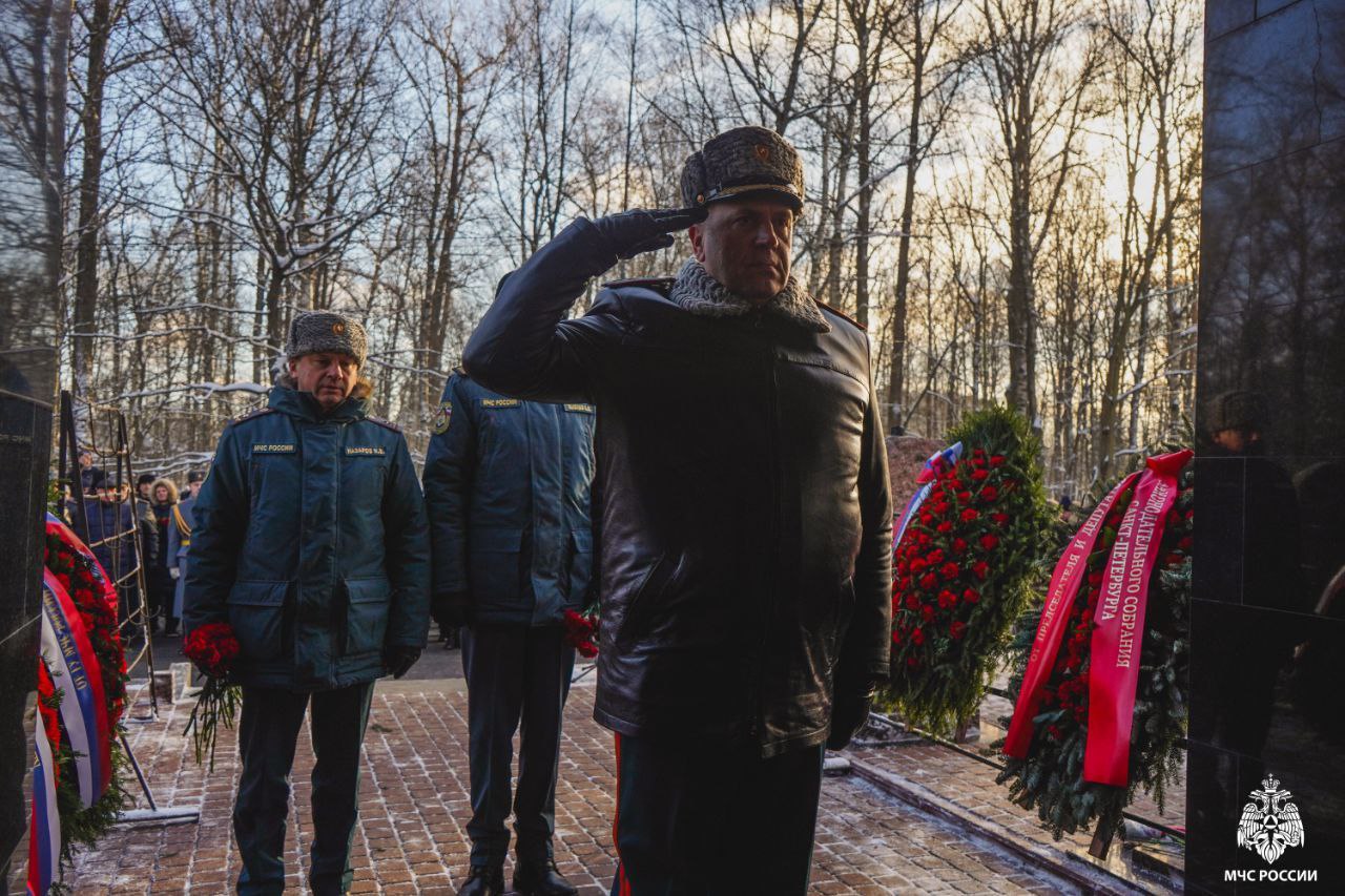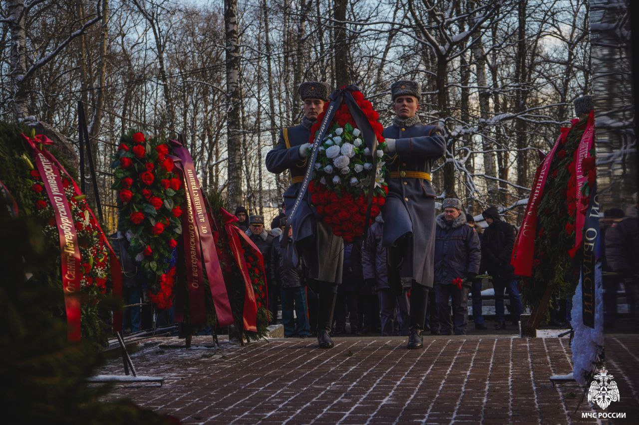 Сегодня на Серафимовском кладбище прошла торжественно-траурная церемония возложения венков к мемориалу пожарным, погибшим при тушении пожара в гостинице «Ленинград».