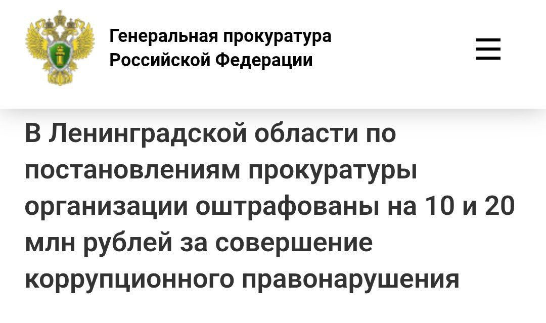 В Ленинградской области по постановлениям прокуратуры организации оштрафованы на 10 и 20 млн рублей за совершение коррупционного правонарушения