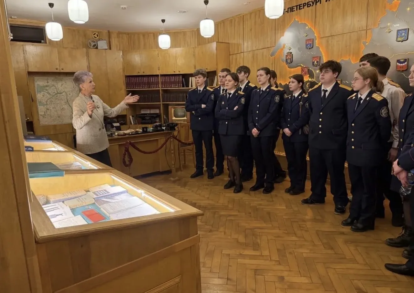 В ходе экскурсии ребята смогли увидеть рабочие инструменты руководителя следствия, такие как сборники уголовного законодательства СССР, рукописные шахматки уголовных дел и графики роста преступности, старые бланки процессуальных документов, печатную машинку, пленочный фотоаппарат, сейф, материалы уголовных дел, отпечатанные вручную, телефон с дисковым набором, карту Ленинграда 1965 года и, конечно, форменное обмундирование того времени, которые подчёркивают уникальность исторического периода.