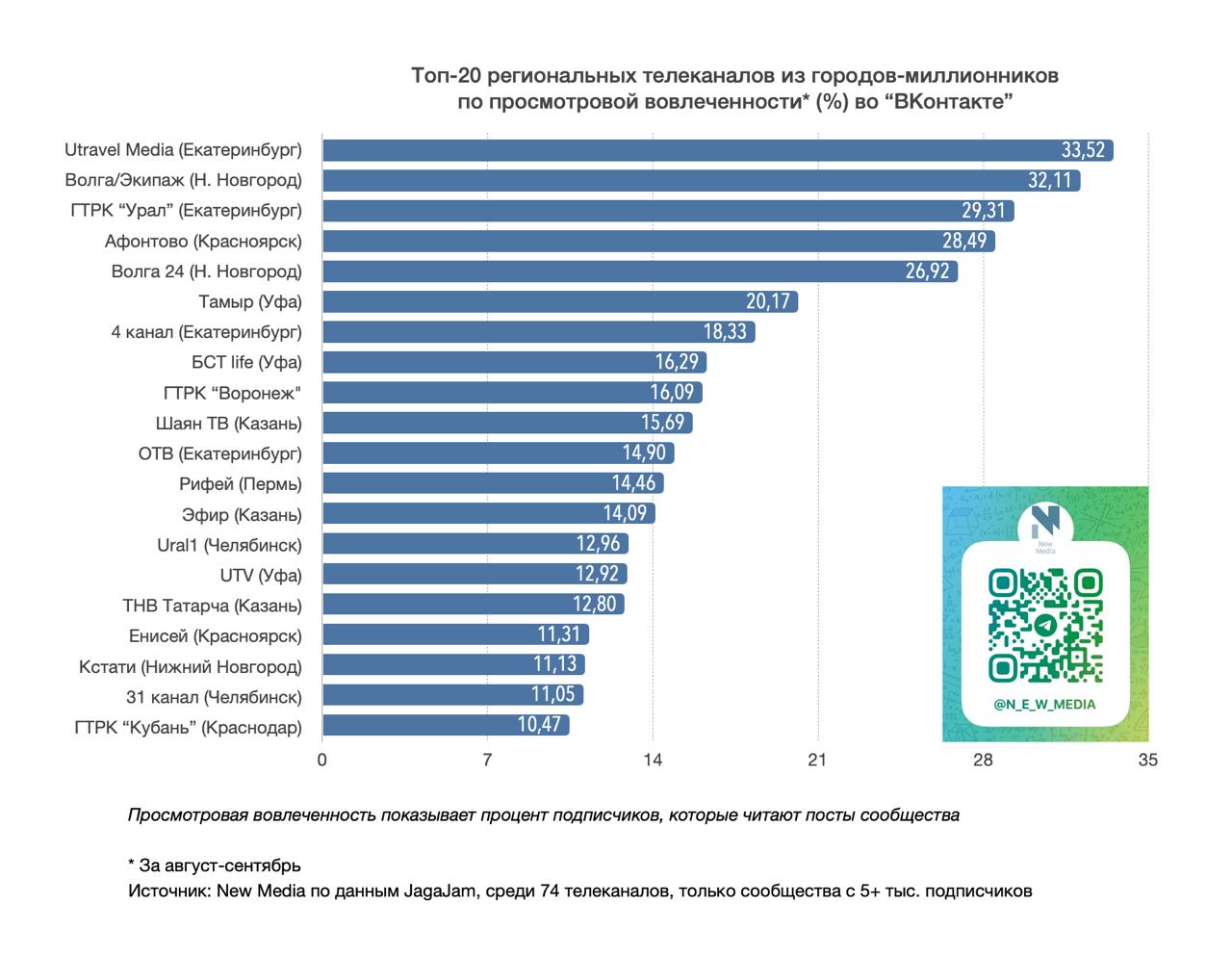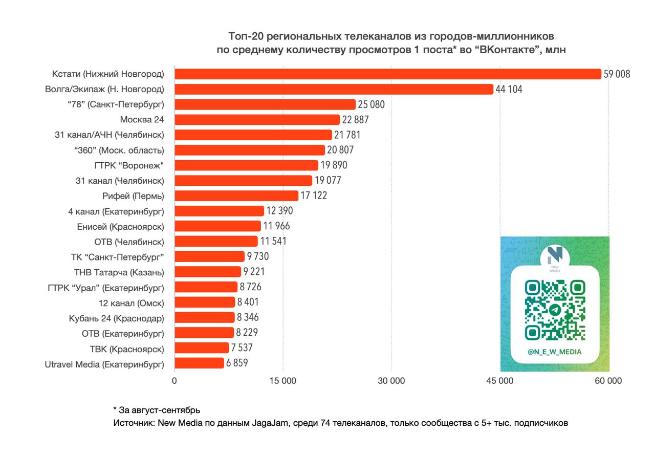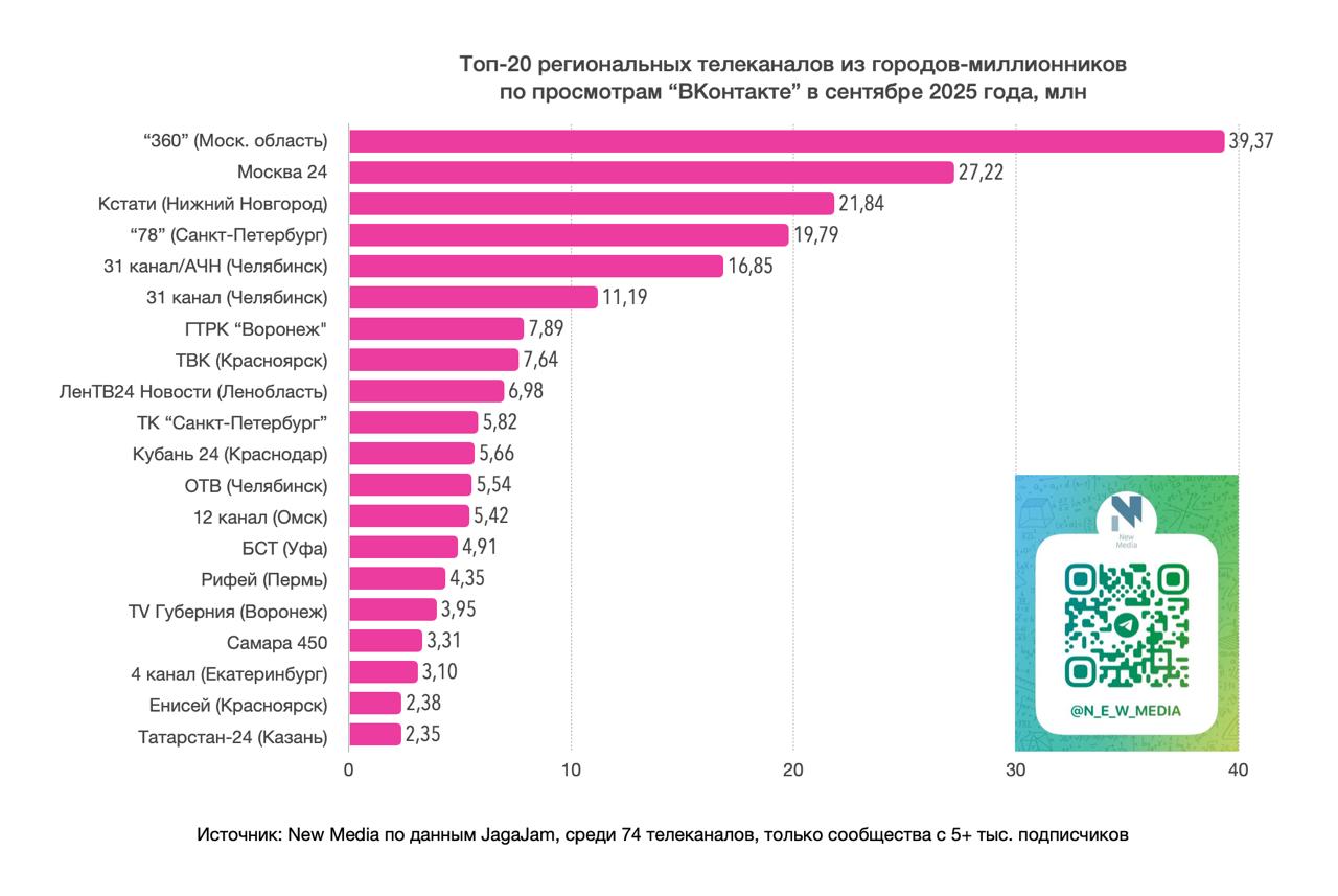 Топ-20 региональных телеканалов "ВКонтакте" в сентябре 2025 года