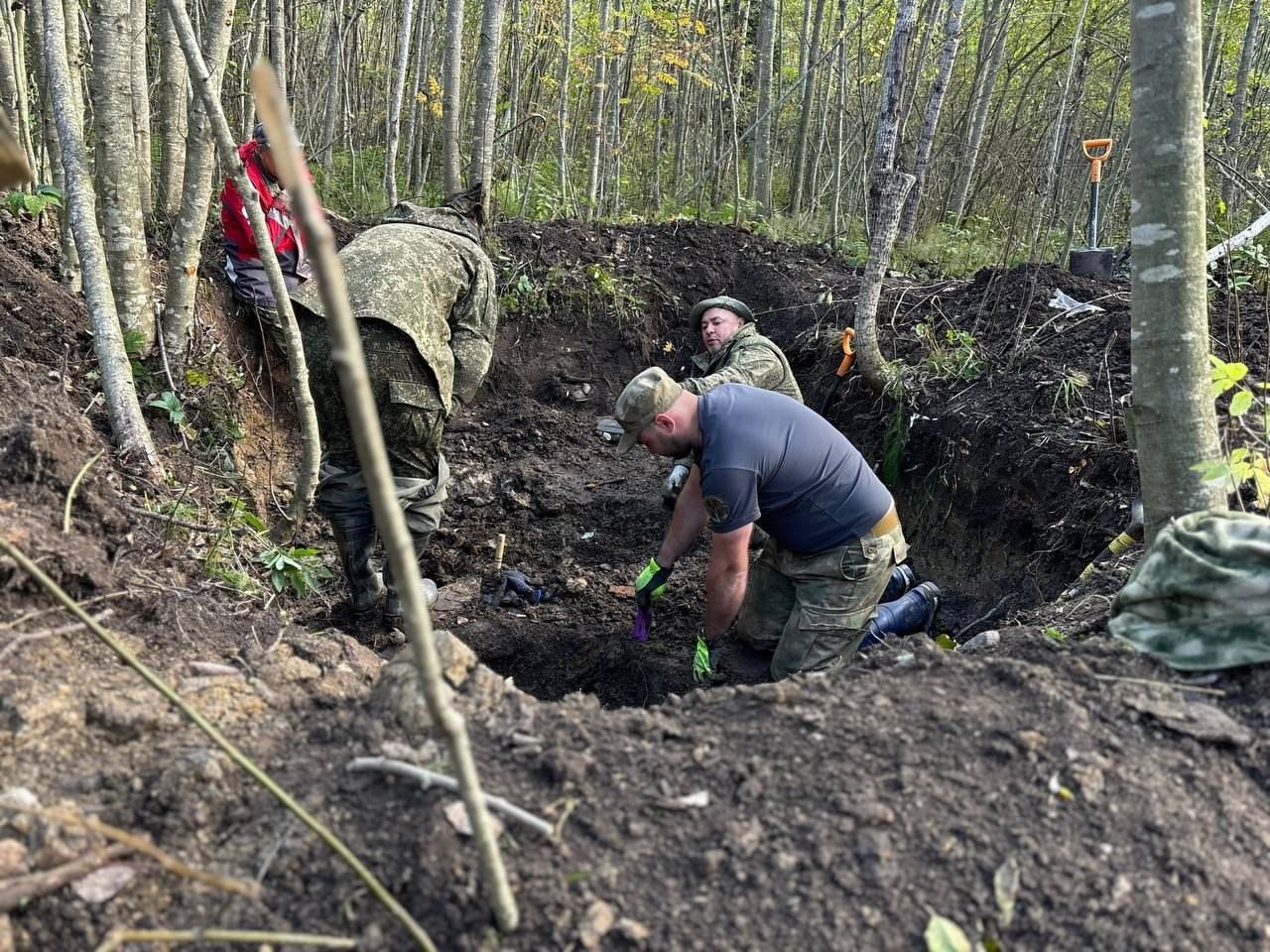 Как сообщили в пресс-службе Поисковое движение России/Ленинградская область" во "ВКонтакте" 15 октября, в воронке не менее 17 человек. Вместе с останками воинов обнаружили три медальона. Два из них оказались открытыми и пустыми, третий был плотно закрыт.