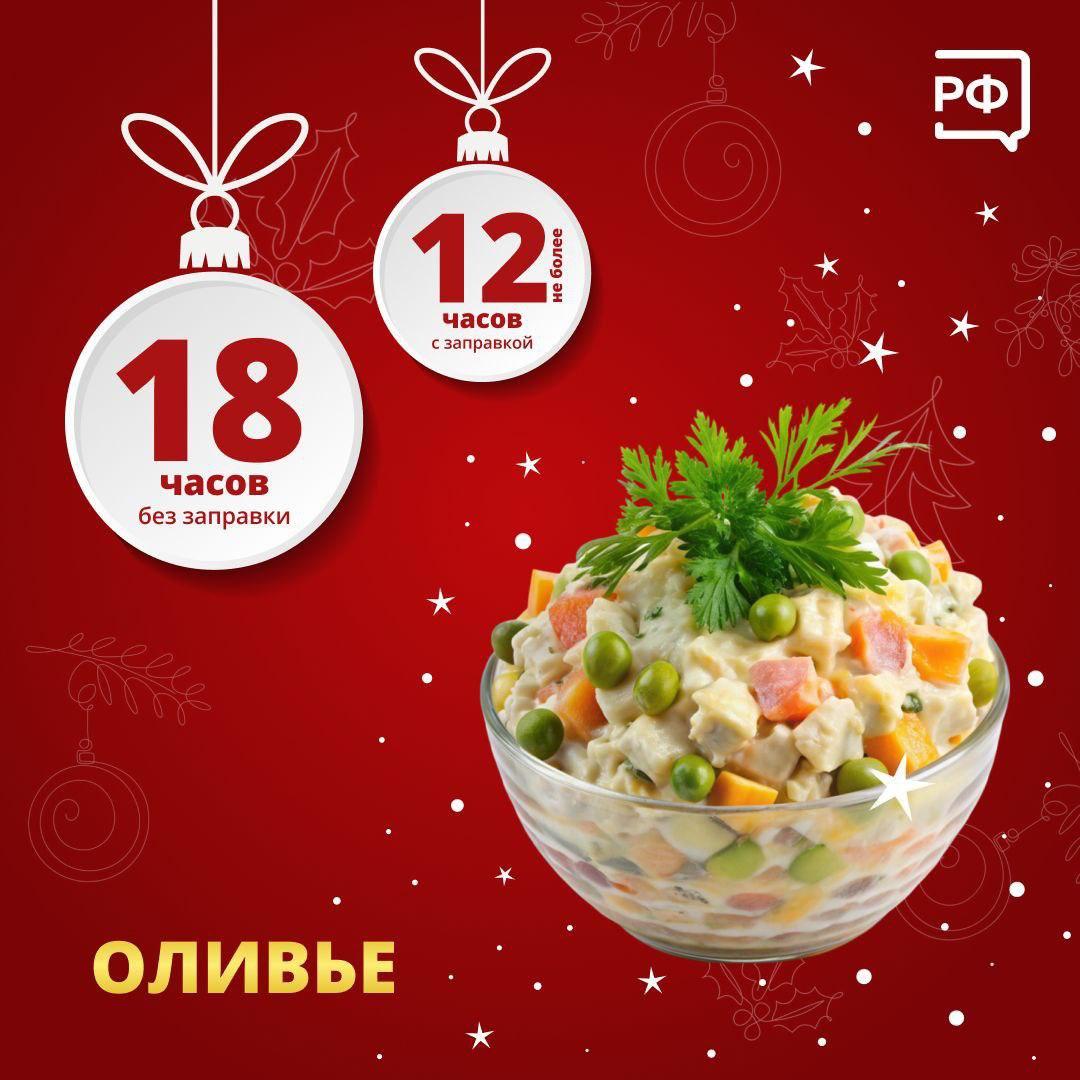 Комитет по здравоохранению Ленинградской области напомнил о сроках годности самых популярных новогодних угощений. Например, «Оливье», «Селедка под шубой» и «Винегрет» с заправкой, а также холодец хранятся не более 12 часов.