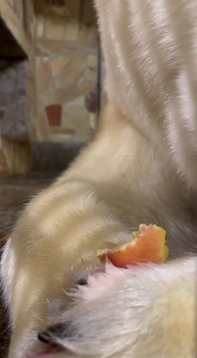 Красавица Хаарчаана, несмотря на санитарный день в Ленинградском зоопарке, всё равно решила порадовать своих преданных фанатов качественным контентом. АСМР с хрумкающей яблоко белой медведицей обладает поистине умиротворяющим эффектом.