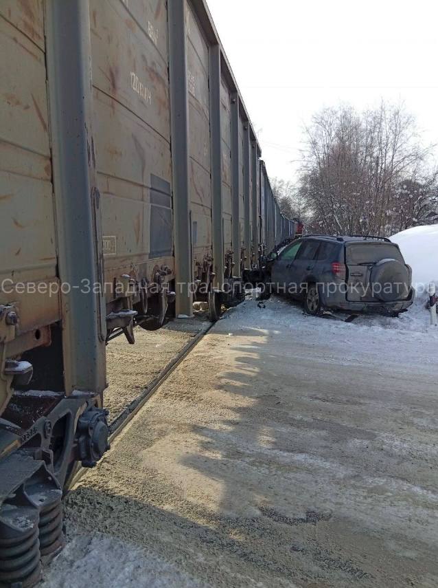Поезд врезался в машину на ж/д переезде в Ленобласти. Около станции «Рябово» Toyota выехала на пути на красный свет — машинист товарняка начал тормозить, но избежать столкновения не удалось.