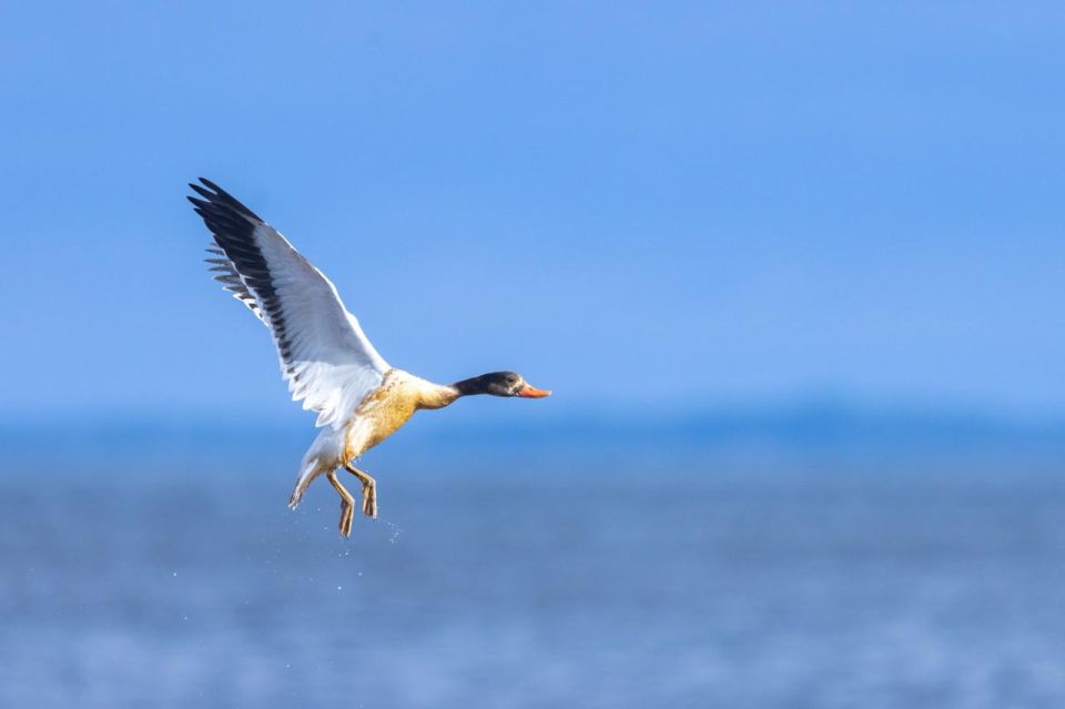 На Финском заливе заметили необычную и яркую утку - пеганку. Птица с большим удовольствием поедала мелкий планктон у побережья, вытягивая длинную шею и процеживая клювом водоросли. Иногда ей приходилось улетать подальше от людей...