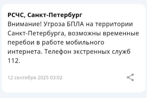 12.09.2025, 03:45 «Силы ПВО работаю по БПЛА над территорией Волосовского, Тосненского, Гатчинского, Ломоносовского районов Ленобласти и Пушкинского района Петербурга», — сообщил губернатор Ленобласти. @fontankaspb// Фонтанка SPB Online