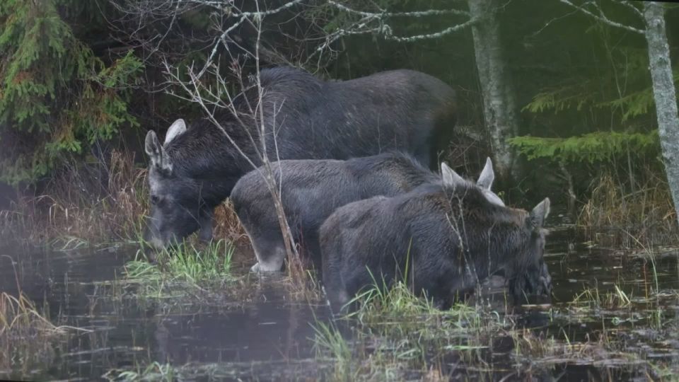 Мама-лосиха и два лосенка увлеченно дегустировали растительность. Старшая сохатая внешне была совершенно невозмутима. Малыши же, не отвлекаясь от пережевывания, поглядывали то на родительницу, то по сторонам.: Нижне-Свирский государственный...