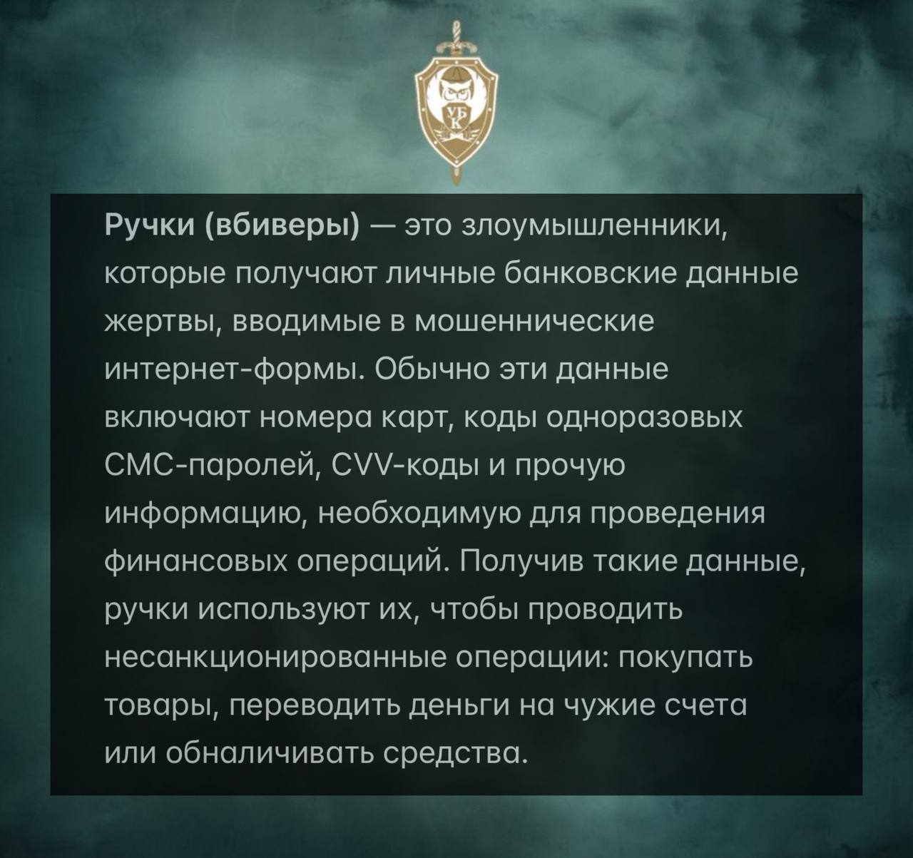 3. Обработка данных ручками: ручки получают эти данные в режиме реального времени и активно используют их для перевода денег с карты жертвы на иные реквизиты или для совершения покупок.
