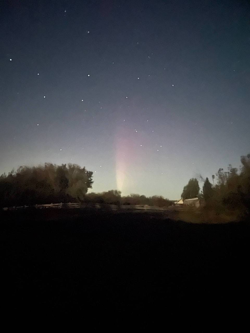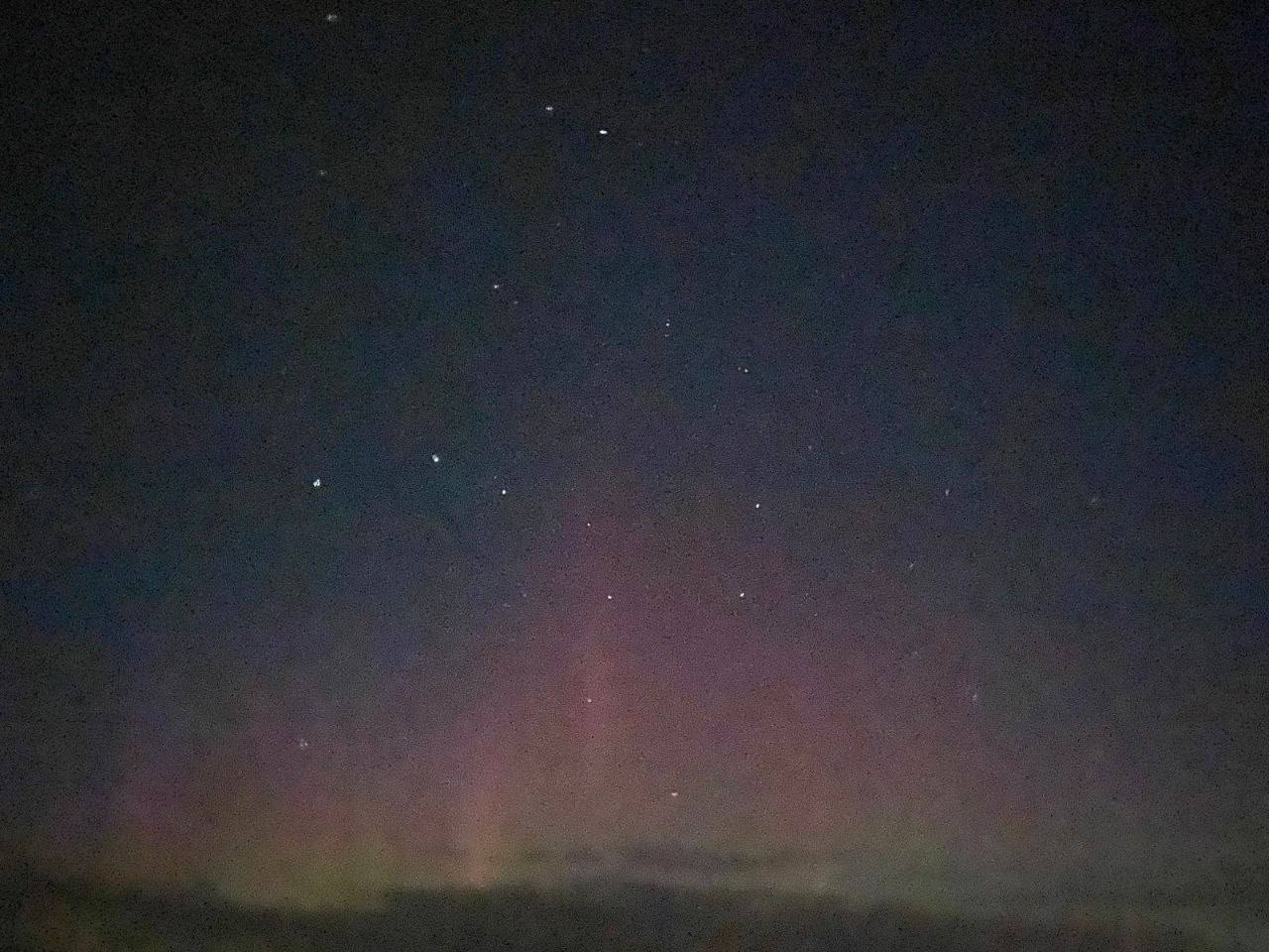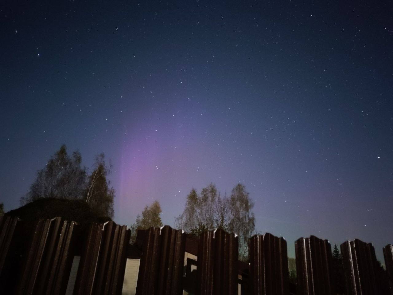 «Так, небо над Ленинградской областью снова озарилось зелено-фиолетовым полярным сиянием. Северное сияние наблюдается в Приозерском, Всеволожском, Выборгском и Бокситогорском районах Ленобласти. Свечению даже не помешала яркая засветка.