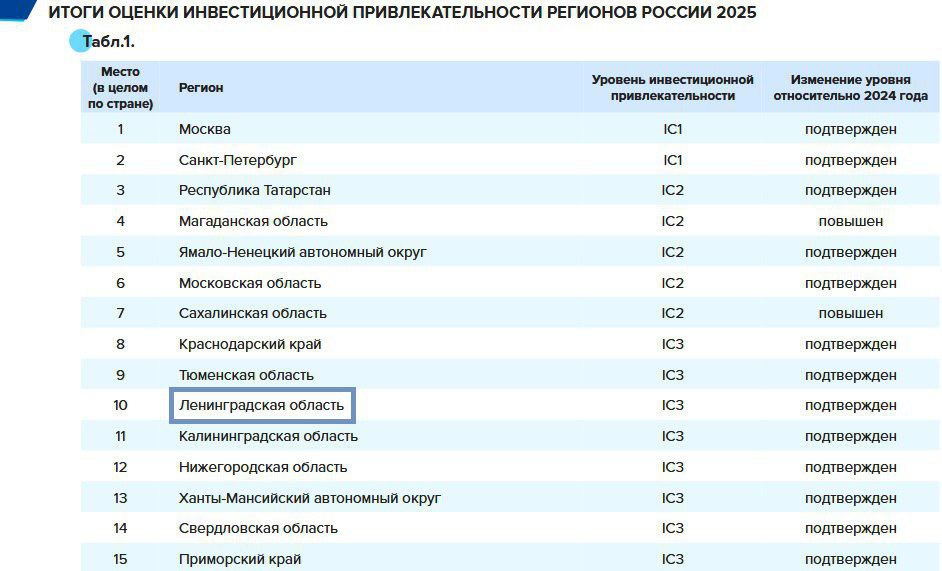 Ленобласть — в десятке самых инвестиционно привлекательных регионов России!