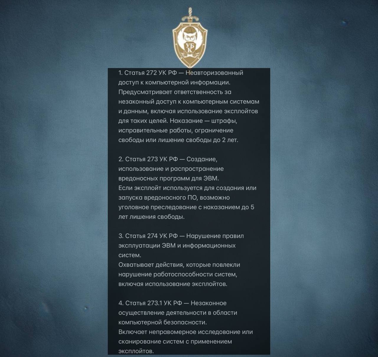 В российском законодательстве использование эксплойтов без разрешения относится к неправомерным действиям и квалифицируется по различным статьям Уголовного кодекса РФ, в зависимости от характера и последствий действий: