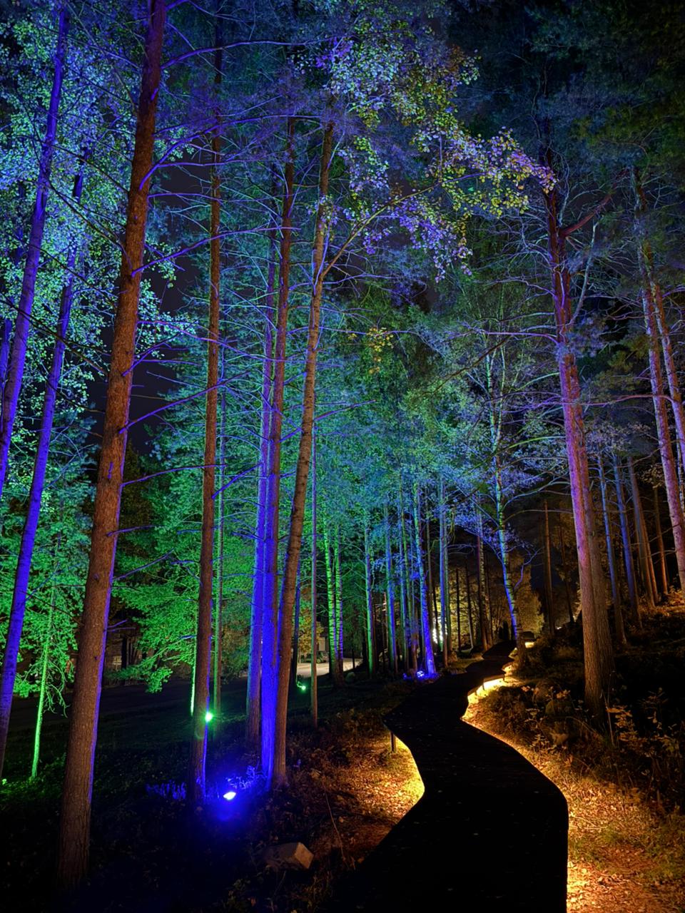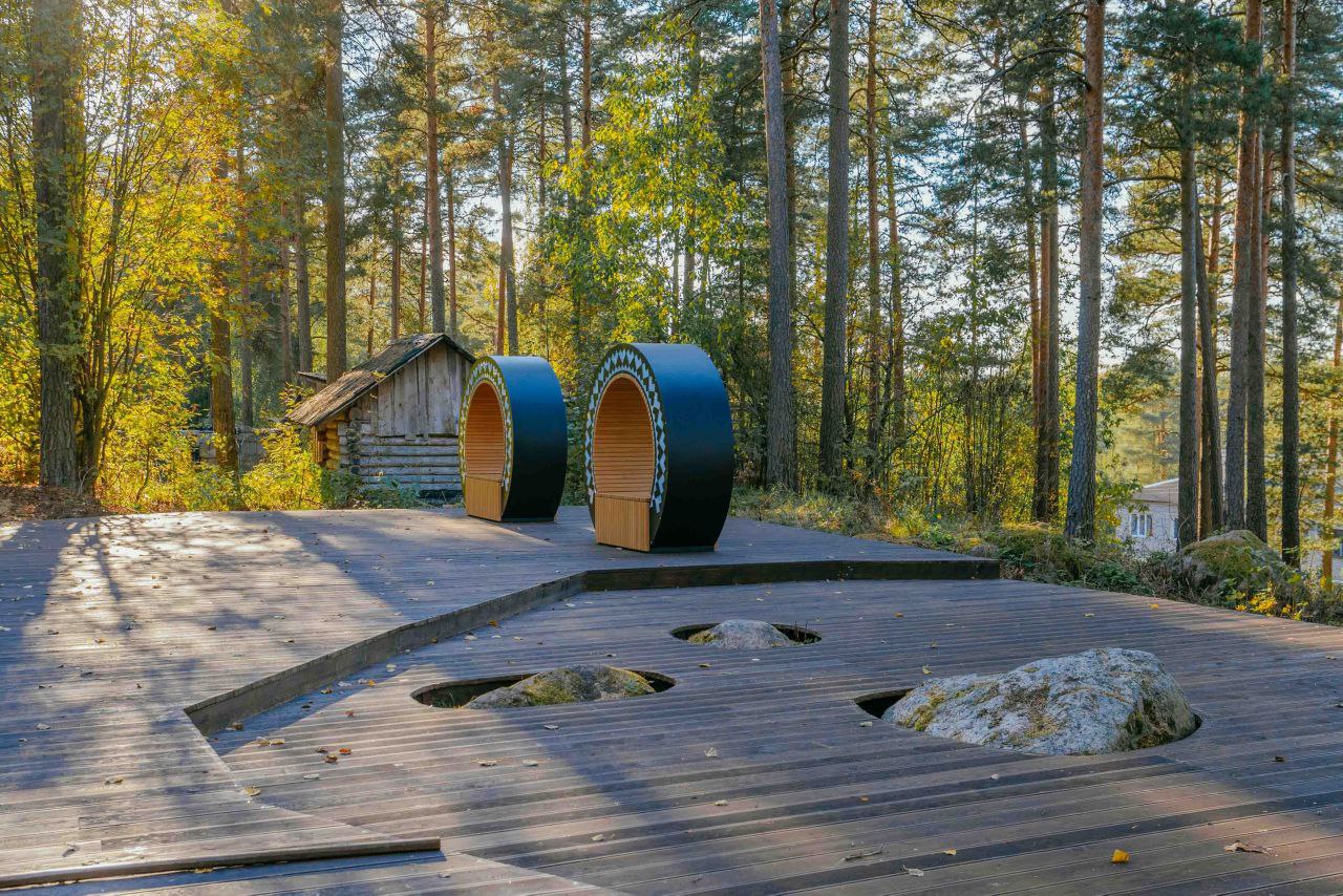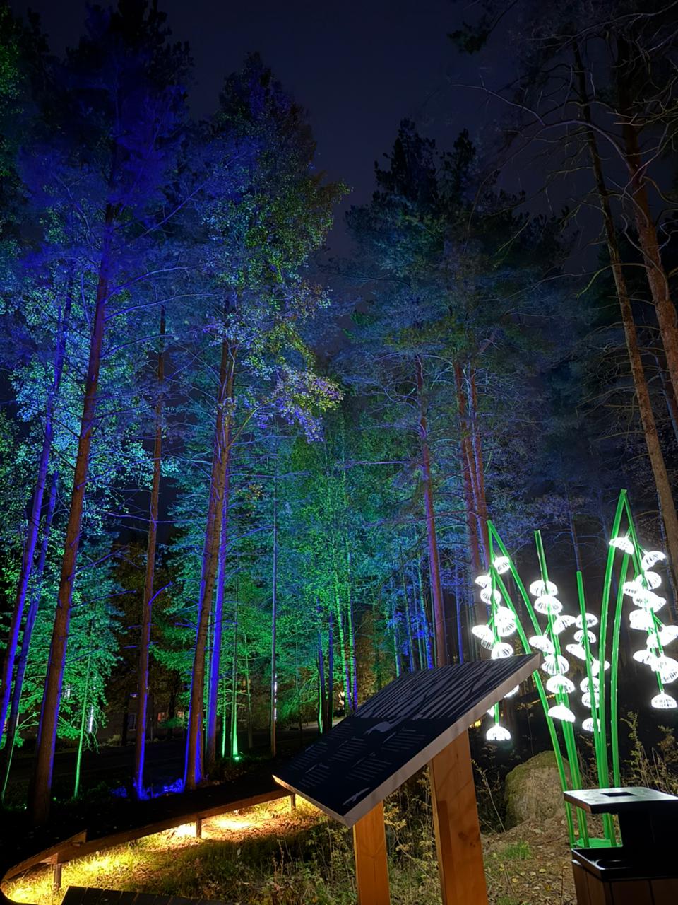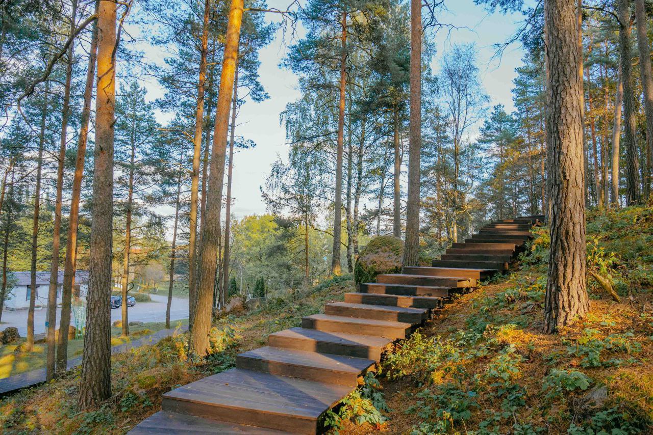 Главный маршрут проходит по деревянной лестнице. Тропы из натуральных материалов — дерева и гранитного отсева — повторяют изгибы рельефа. Можно покачаться на качелях и оценить бережно включенные в проект валуны. Опоры светильников по цвету и форме напоминают стволы деревьев, органично вписываются в природный пейзаж и освещают деревья и дорожки, поэтому здесь можно прогуляться и темным вечером.