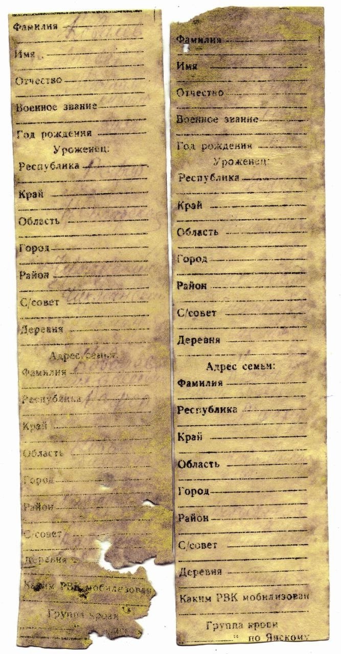 Вместе с павшими героями обнаружили две подписные ложки "Д.Павлов" и "Фролков", стеклянную флягу, монеты, кружки, столовый нож и три солдатских медальона. По ним удалось установить личность одного защитника: Ковалев Павел Михайлович, уроженец Новосибирской области, красноармеец-сапер.