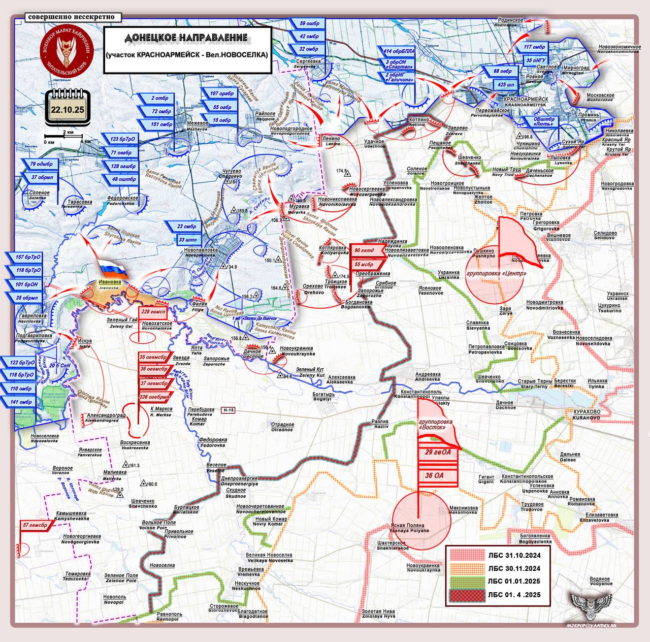 После того, как ВС РФ освободили н.п. Ленино на границе с Днепропетровской областью Украины, мы в сводке от 20.10.25 г. предположили, что это элемент операции по выходу к рубежу обороны ВСУ Сергеевка - Межевое - Федоровское - Новопавловка (в оперативном плане) и подготовительные действия по ликвидации Новопавловского выступа ВСУ (в тактическом).