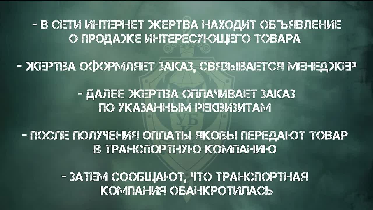 В сети Интернет жертва находит объявление о продаже интересующего товара, оформляет заказ, после чего на связь выходит менеджер и присылает реквизиты для оплаты. Жертва оплачивает заказ по указанным реквизитам. После получения оплаты заказ якобы передают в транспортную компанию. Затем сообщают, что транспортная компания обанкротилась.