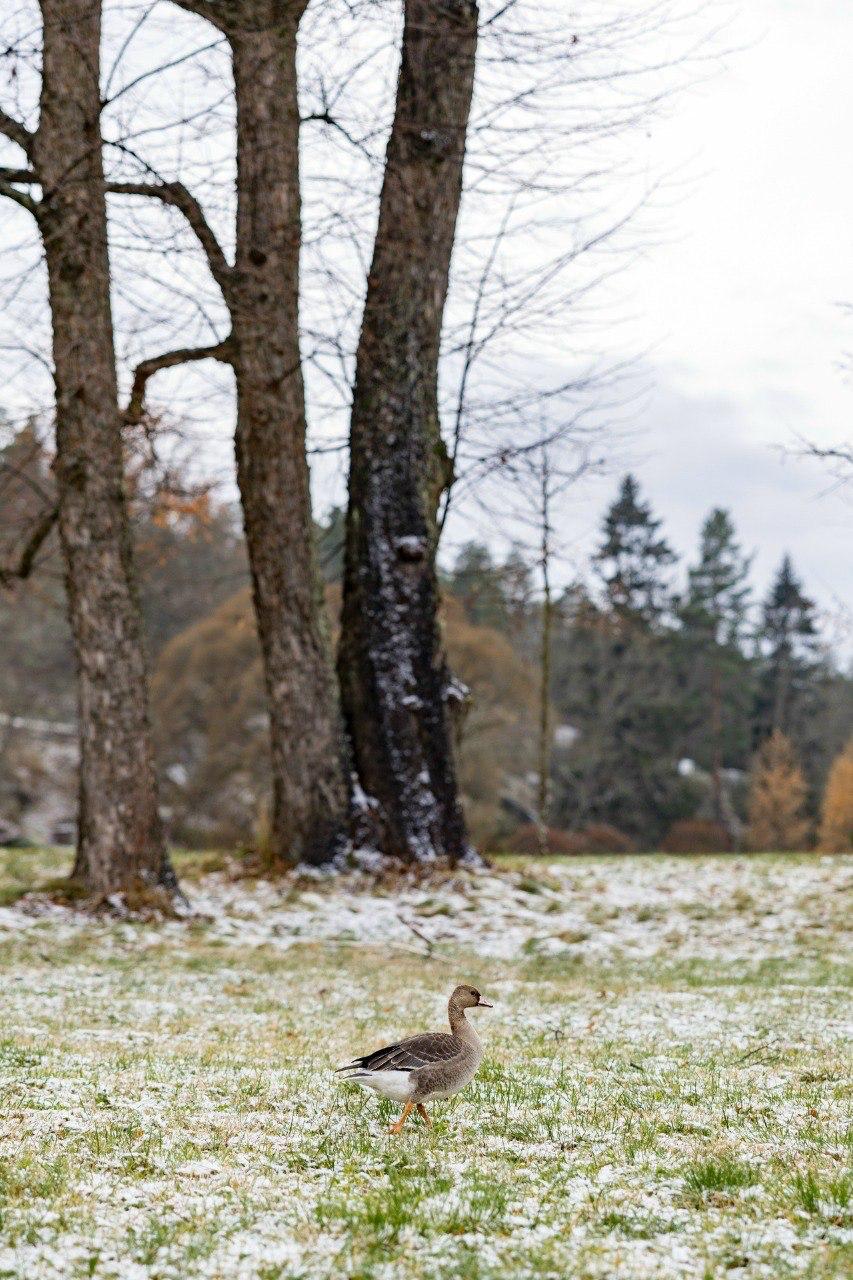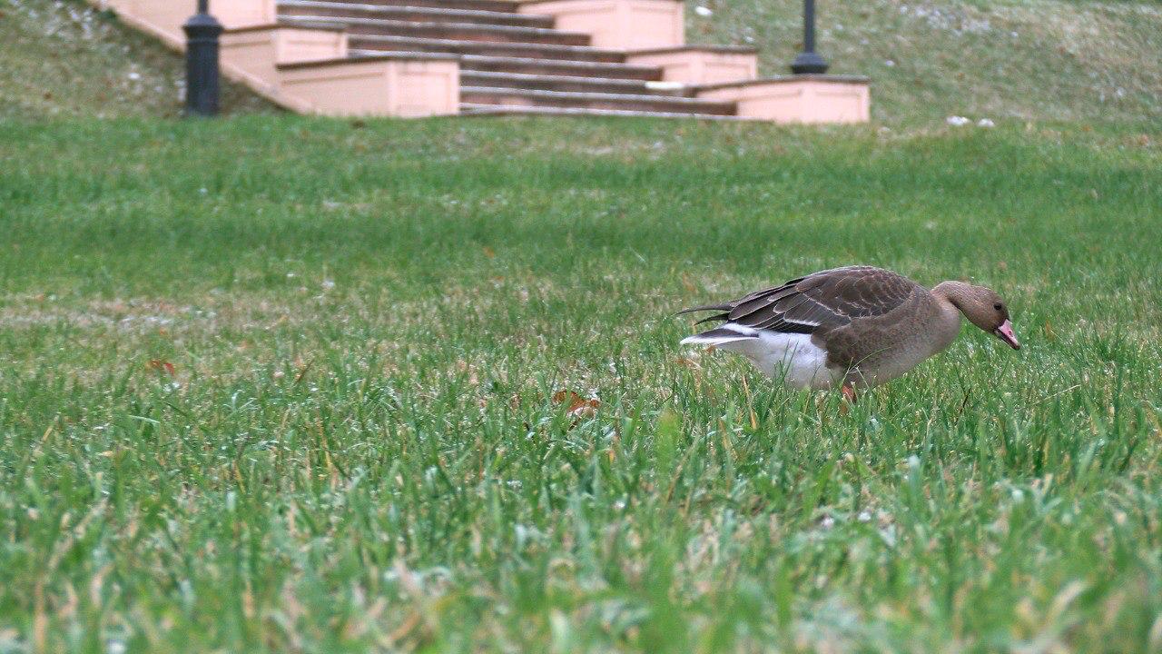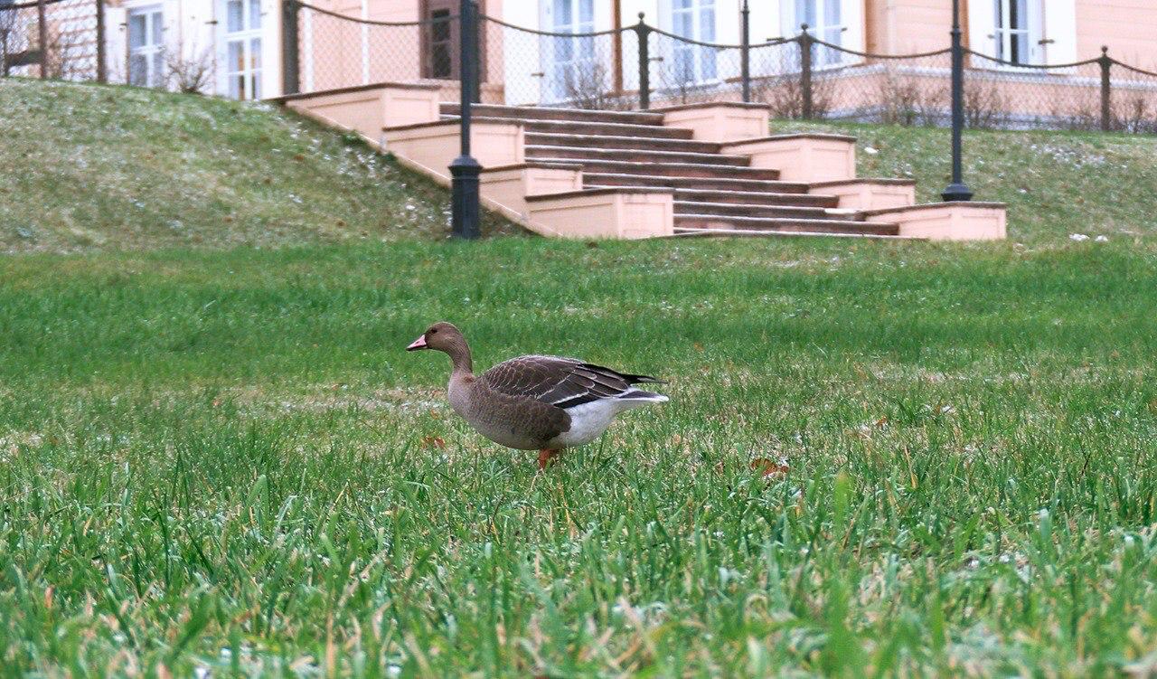 Возраст дикого гуся, отдыхающего в парке Монрепо, выдает отсутствие на лбу белого пятна, которое появляется только на второй год жизни. Подкармливать птицу нельзя: для него в заповеднике достаточно естественного корма в виде зеленой травы.