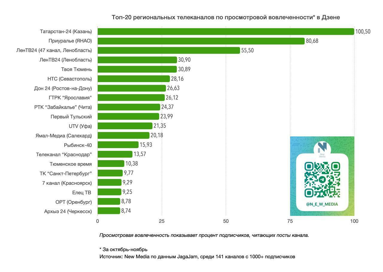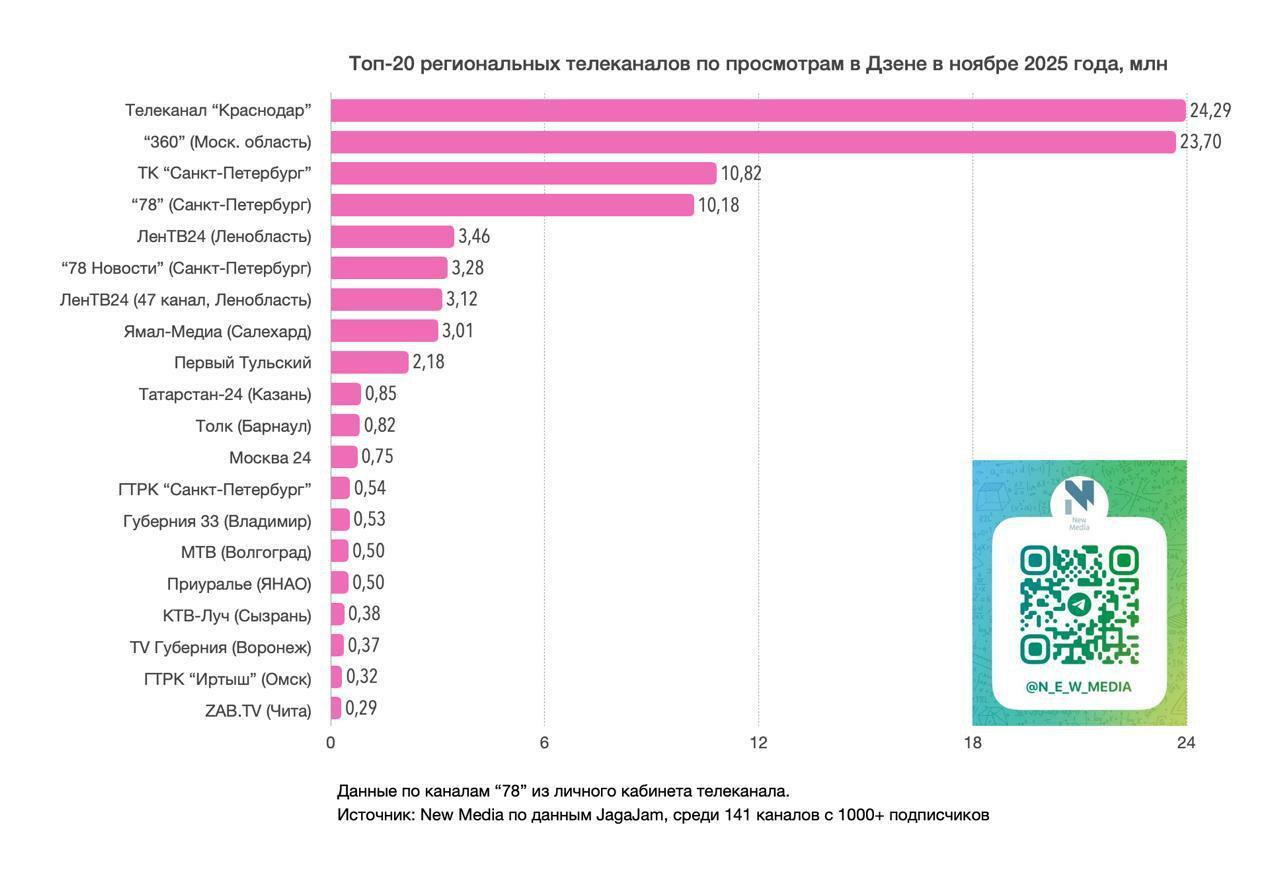 Аналитики @n_e_w_media опубликовали топ региональных телеканалов в Дзене за ноябрь 2025 года. Специалисты оценивали общее количество просмотров в миллионах, среднее количество просмотров публикаций, вовлеченность и количество подписчиков.