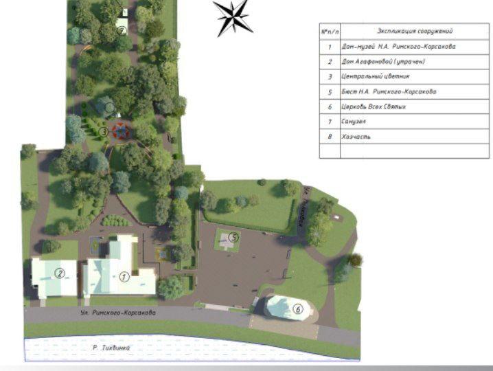 По поручению губернатора Александра Дрозденко был разработан проект благоустройства территории вокруг дома-музея композитора Н.А. Римского-Корсакова в Тихвине. Планируется восстановить историческое мощение, установить подсветку и максимально точно, по воспоминаниям современников, воссоздать сад с клумбами.