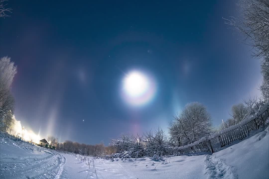 В четверг, 1 января, жители Всеволожского района Ленинградской области наблюдали впечатляющее атмосферное явления - световые столбы. Им также удалось увидеть лунное гало с парселенами и параселенный круг.
