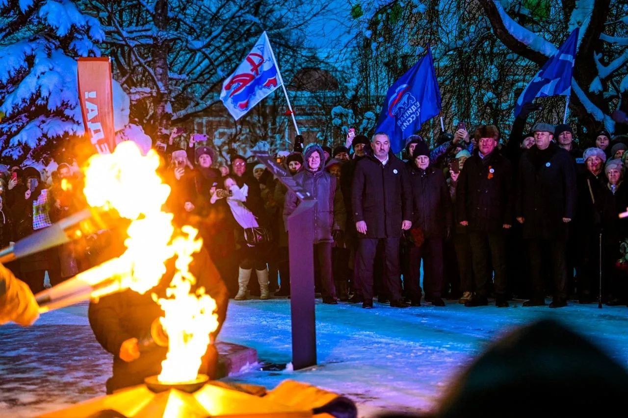 Губернатор Ленинградской области Александр Дрозденко и гендиректор «Газпром межрегионгаз» Сергей Густов зажгли Вечный огонь на мемориале «Слава Героям» в Тихвине. В рамках всероссийской акции «Храним огонь Победы» мемориал подключили к сетевому газу, а Вечный огонь зажгли частицей, доставленной из Волгограда — с Мамаева кургана.