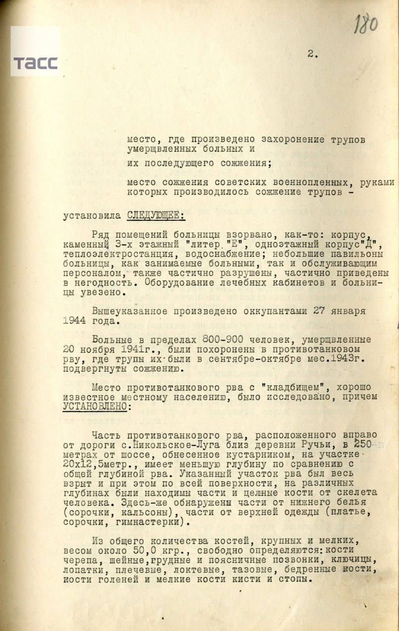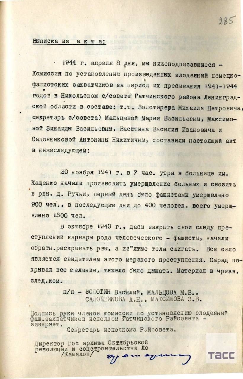 Среди публикуемых документов – выписки из актов о злодеяниях немецко-фашистских захватчиков в Гатчинском районе, копия приговора Военного трибунала Ленинградского фронта от 9 апреля 1944 года в отношении фигурантов дела, протокол допроса главного судмедэксперта Ленинградского фронта Андрея Владимирского, а также акт судебно-медицинской экспертизы, датируемый 20-22 февраля 1944 года.