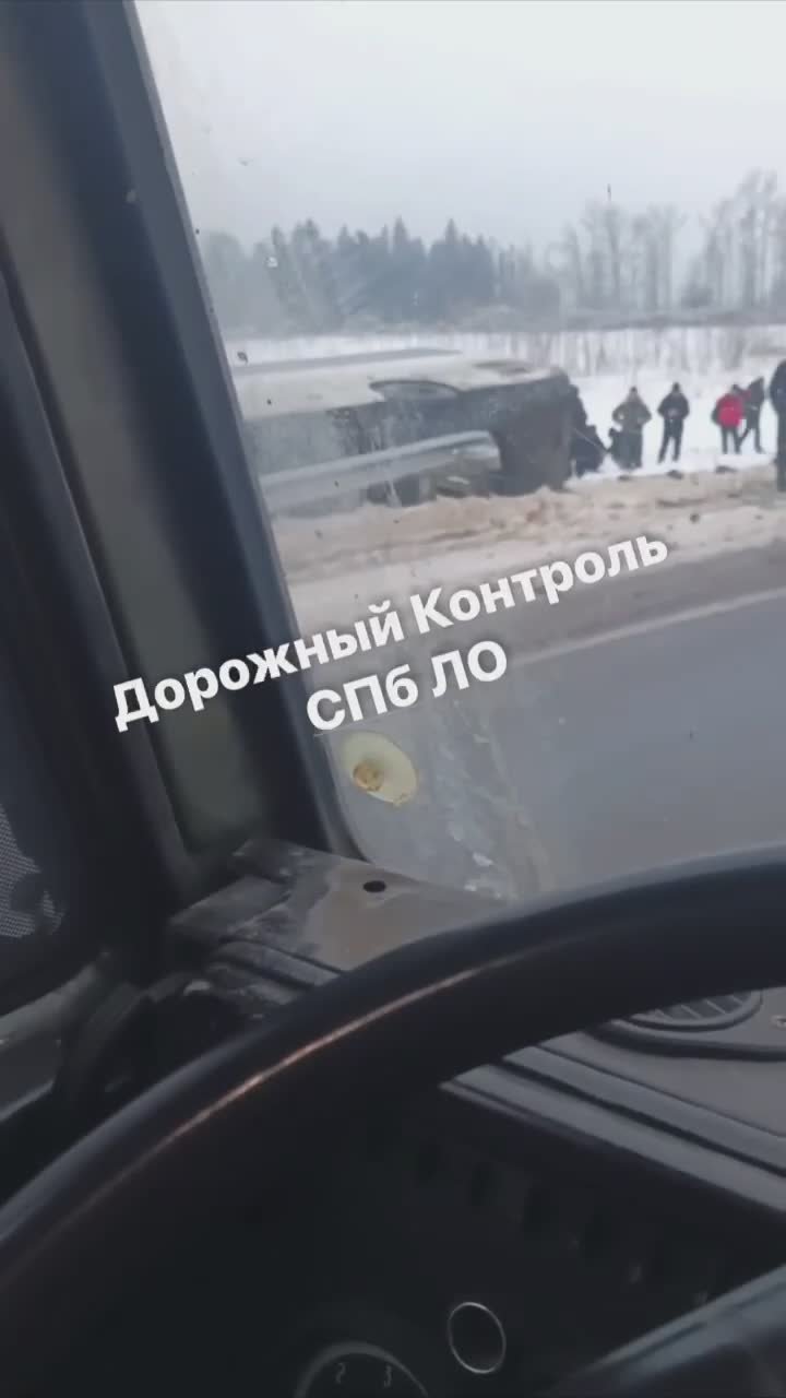Рейсовый автобус перевернулся в Кингисеппском районе Ленобласти. Предварительно, внутри были люди — на видео они стоят возле транспорта.