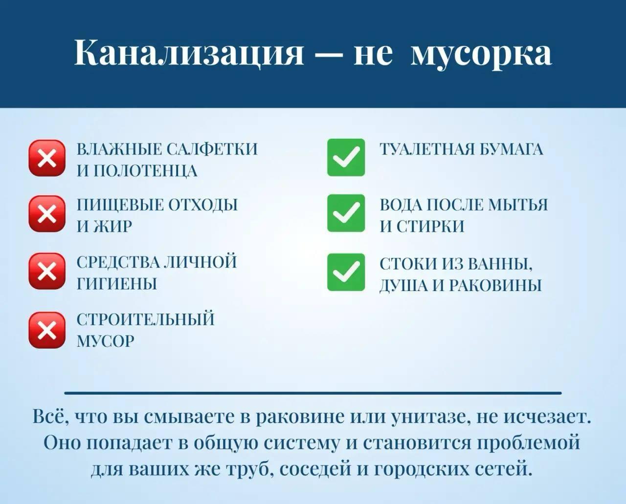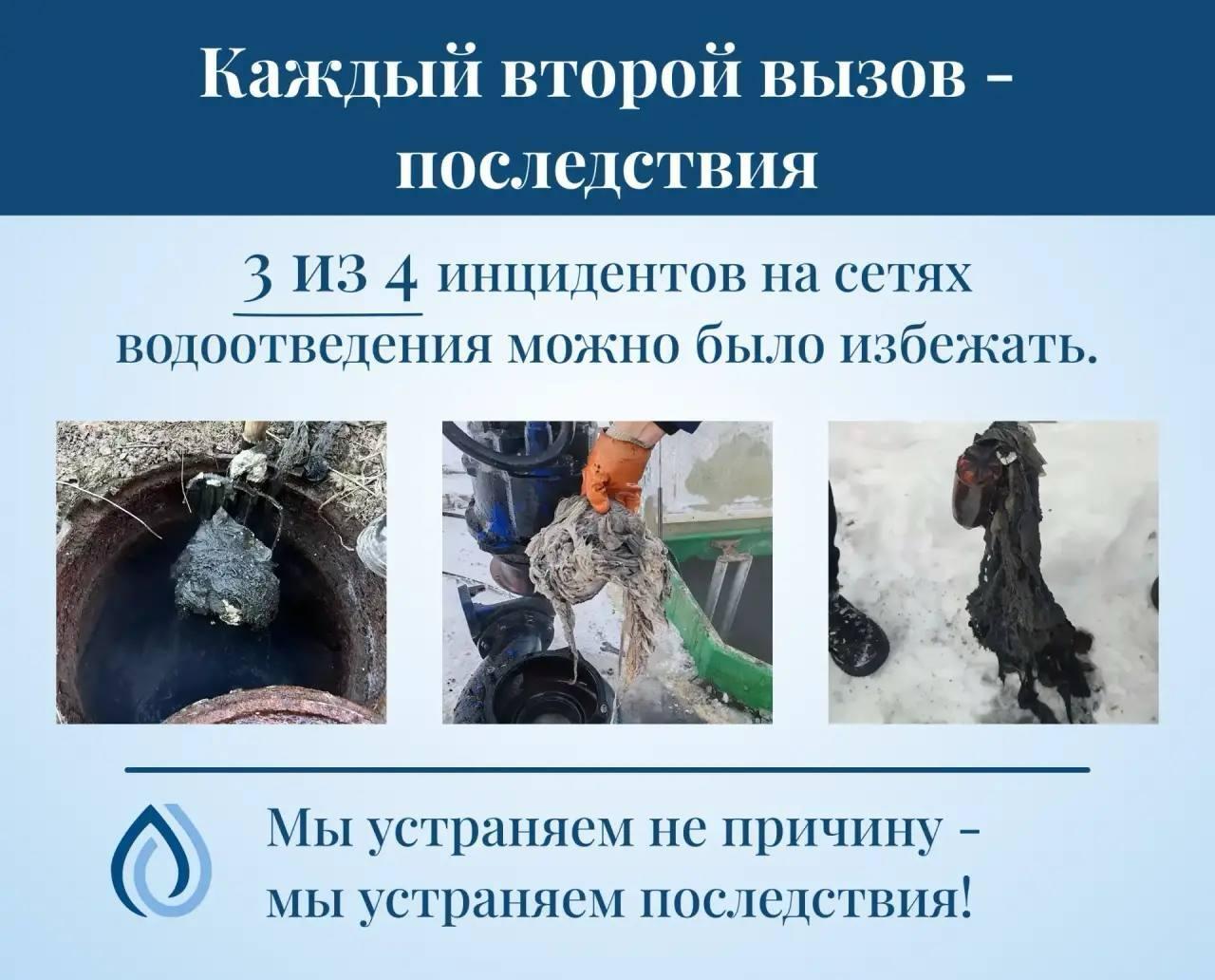 Половина всех аварий на сетях водоснабжения и водоотведения в Ленинградской области происходит по причине бытовых засоров. Пробки в трубах образуются из-за сброса в канализацию предметов, для которых она не предназначена.
