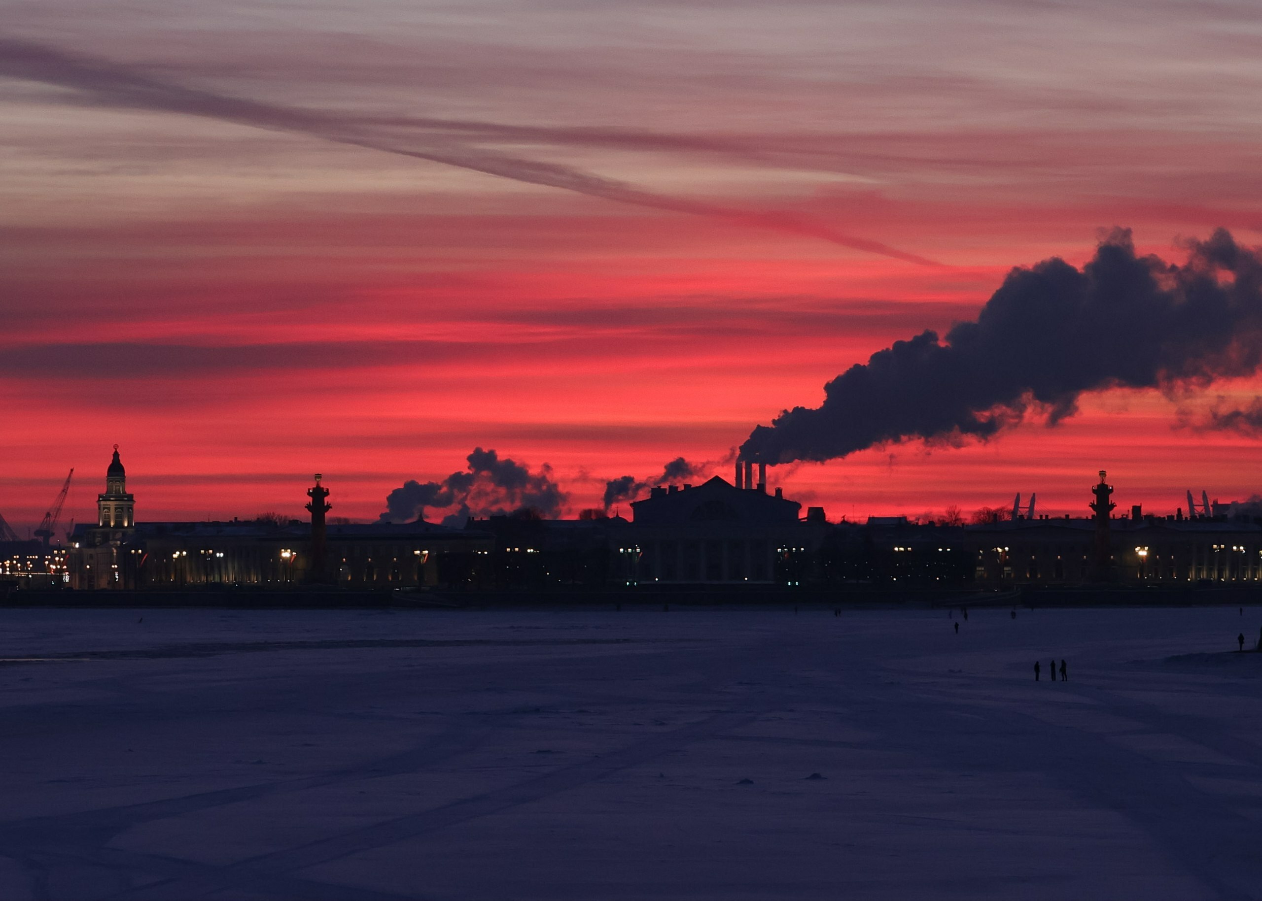 Воскресный закат окрасил морозный Петербург в багровые тона
