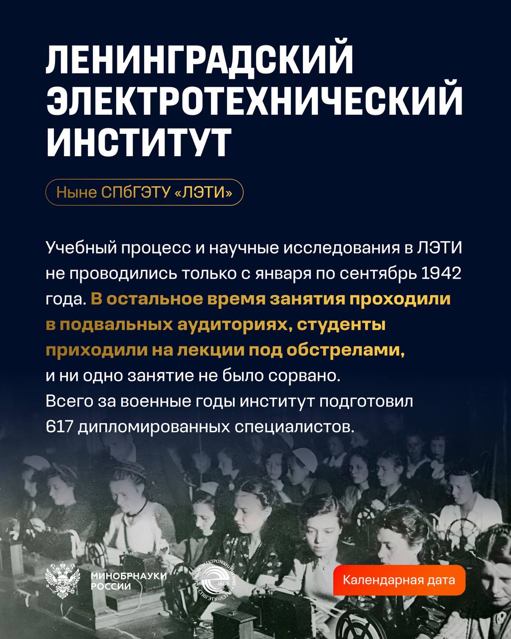 В годы блокады ленинградские вузы продолжали свою деятельность: здесь лечили, рассчитывали «Дорогу жизни»,создавали технологии для фронта и продолжали учить — под обстрелами и в холоде. Санкт-Петербургский политехнический университет Петра Великого и СПбГЭТУ «ЛЭТИ» хранят память об этом подвиге.
