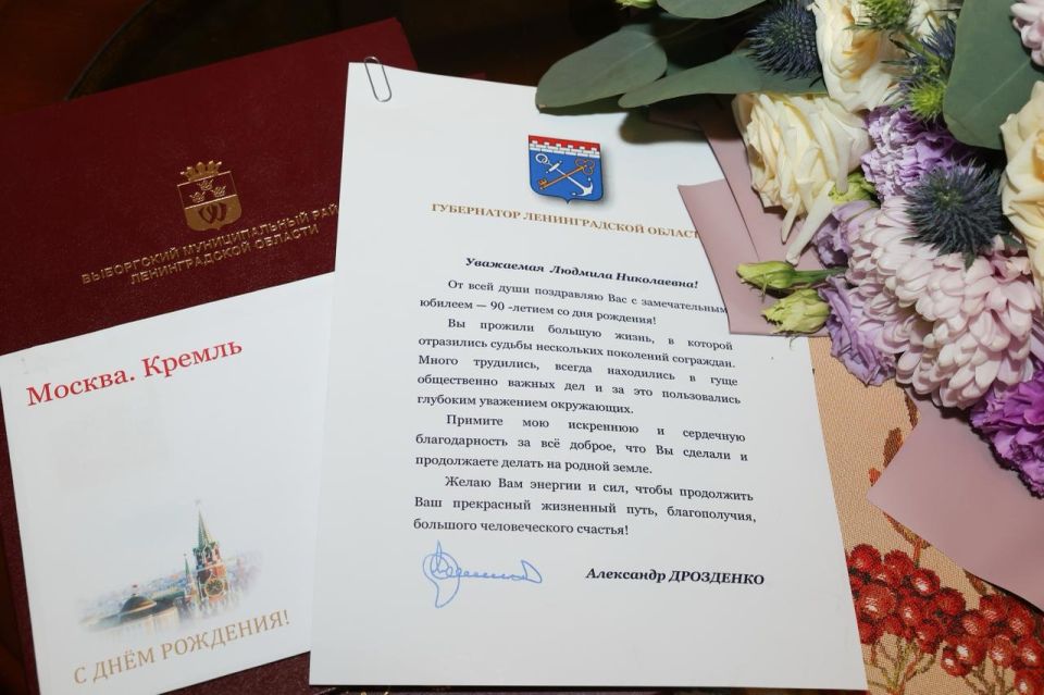 Людмилу Николаевну навестили представители районной администрации. Они передали долгожительнице поздравления от главы Выборгского района Дмитрия Никулина и главы администрации Валерия Савинова, а также вручили имениннице цветы и подарки.