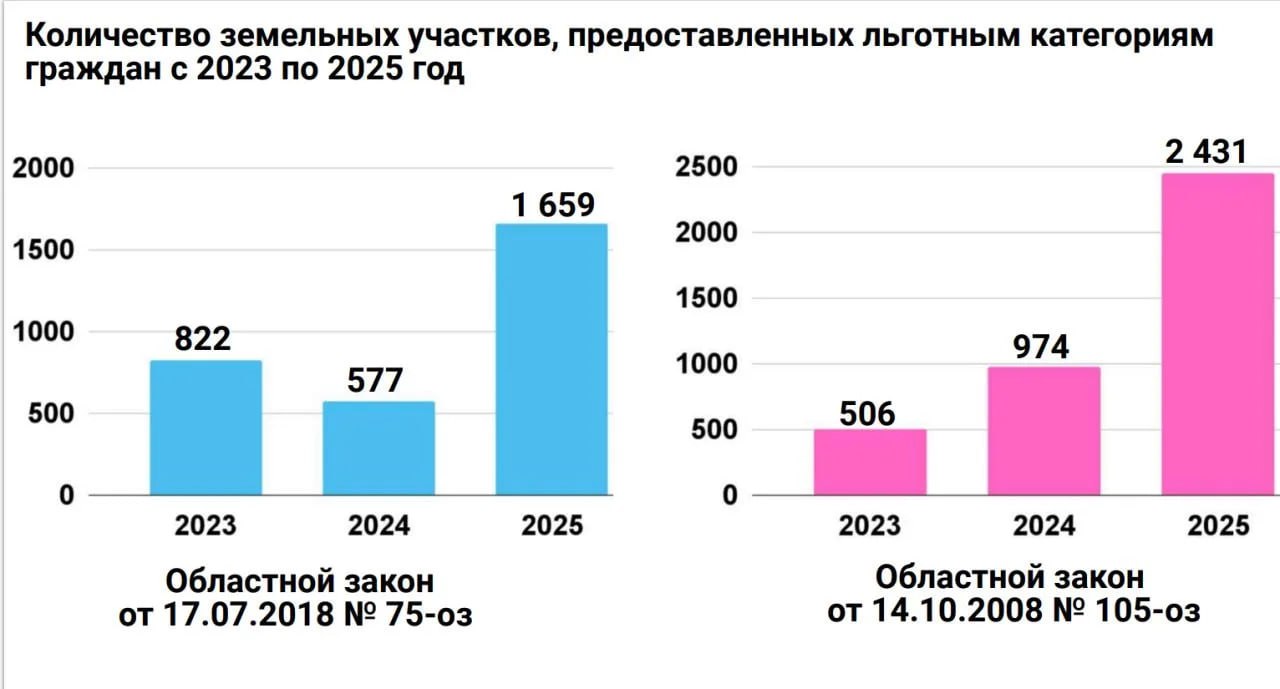 Очередь по выдаче льготных земельных участков в 2025 году стала двигаться почти в 3 раза быстрее. Количество выданных участков для многодетных семей выросло в 2,9 раза, а для иных льготников — в 2,5 раза.