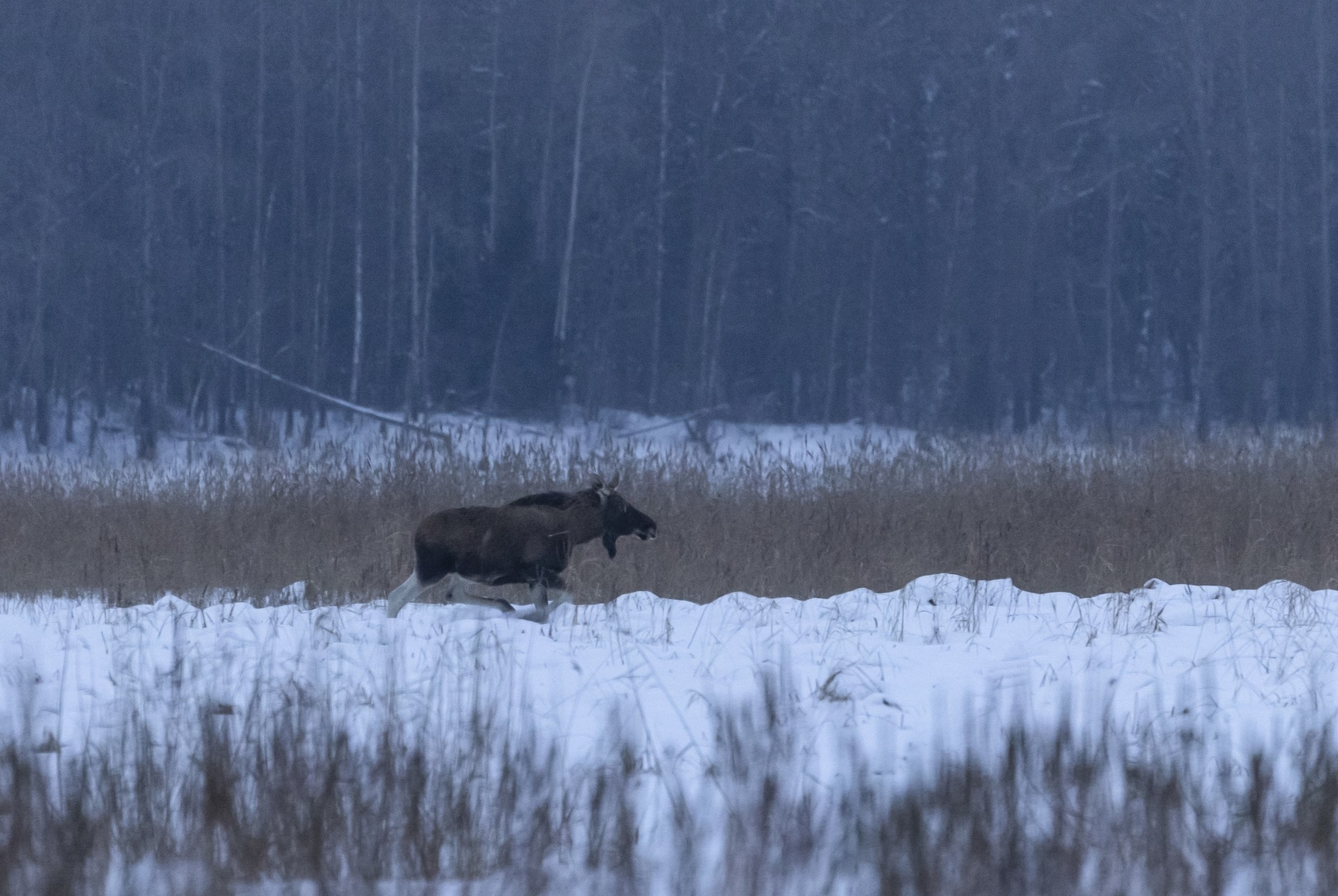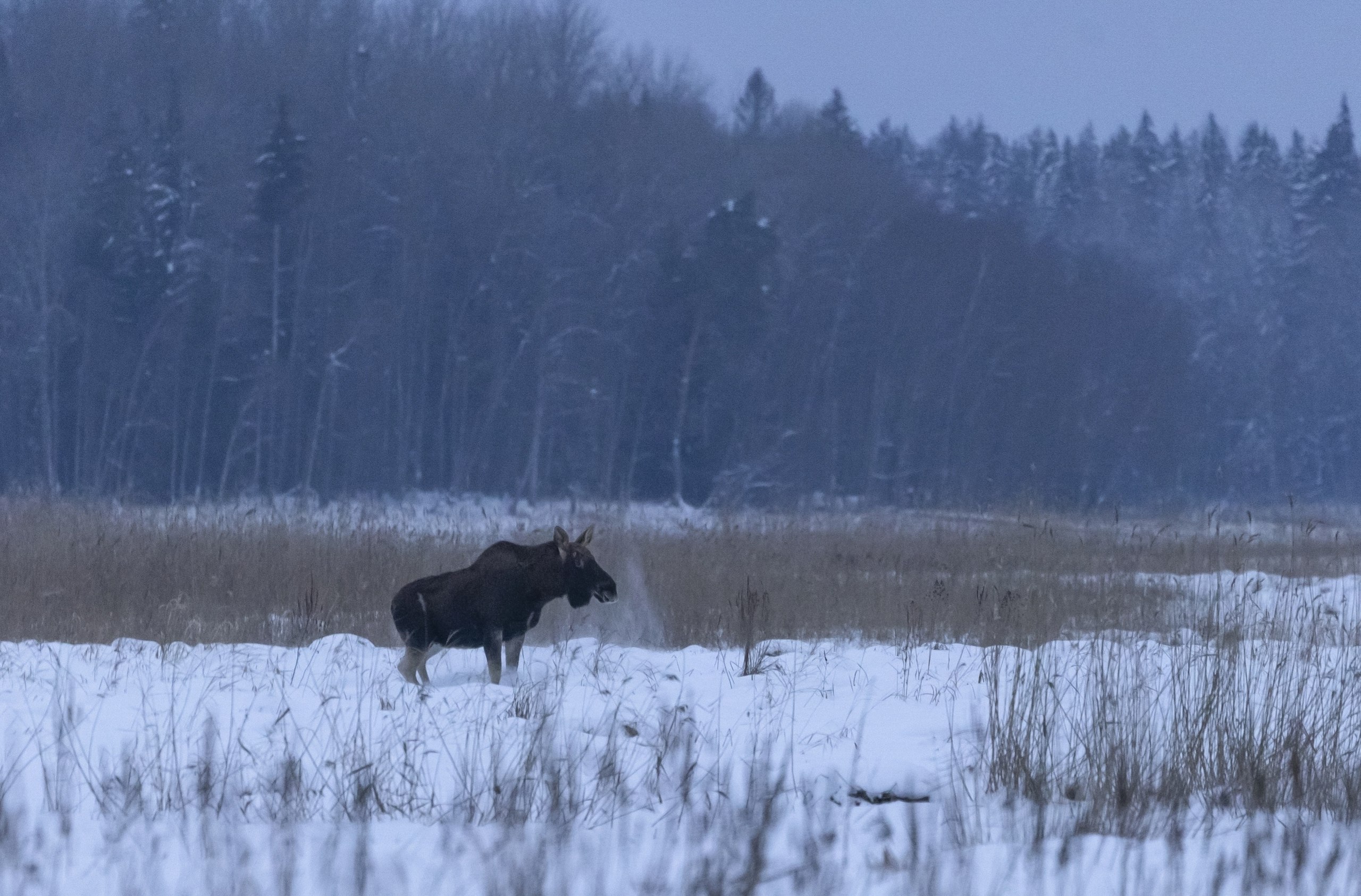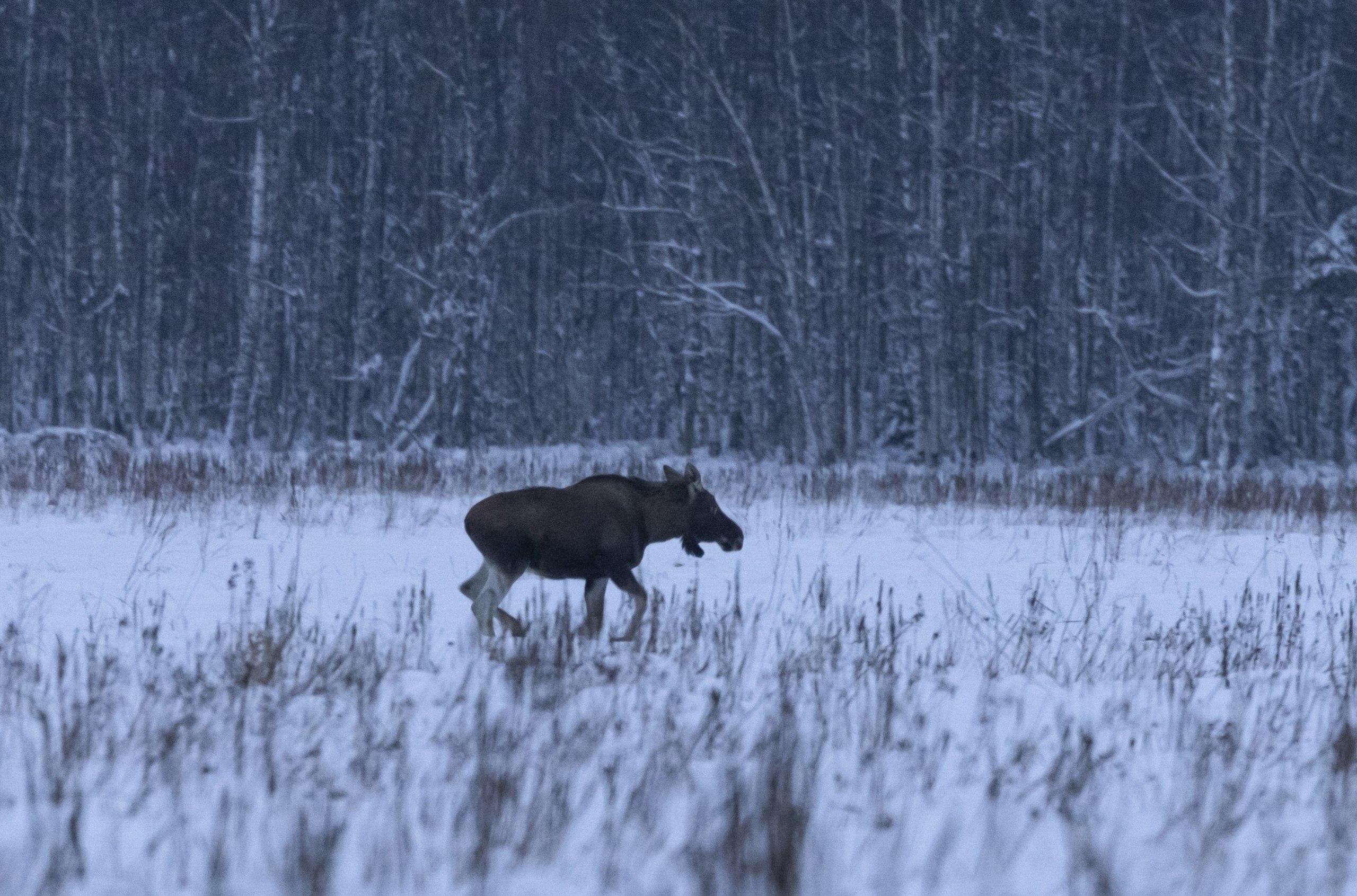 На получившихся кадрах длинноногие лесные великаны степенно пересекают заснеженную местность.