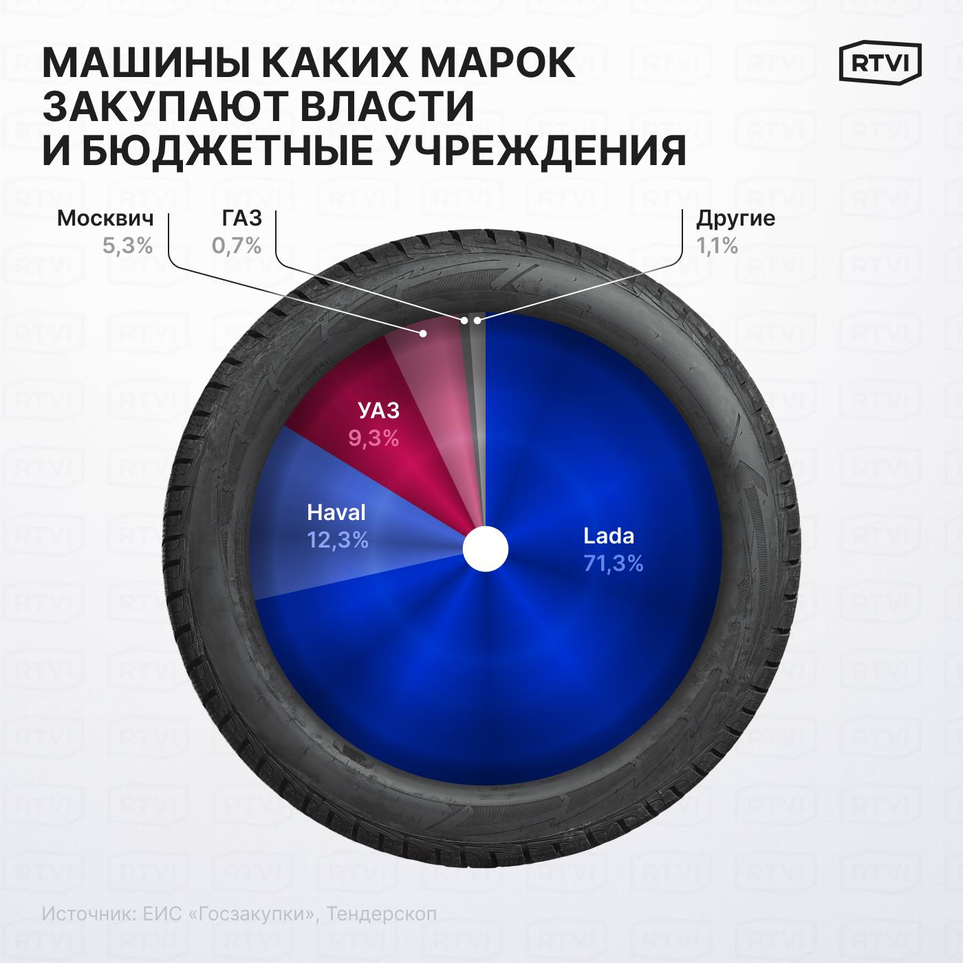 Чаще всего покупали автомобили марки Lada — на них пришлось более 70% контрактов, было поставлено 6 726 автомобилей на сумму порядка 10,35 млрд руб. Доля Lada в общем объеме закупок в денежном выражении — 52,5%. Средняя стоимость двух самых популярных моделей Lada — Niva и Granta — составляет 1,52 млн и 1,13 млн соответственно.