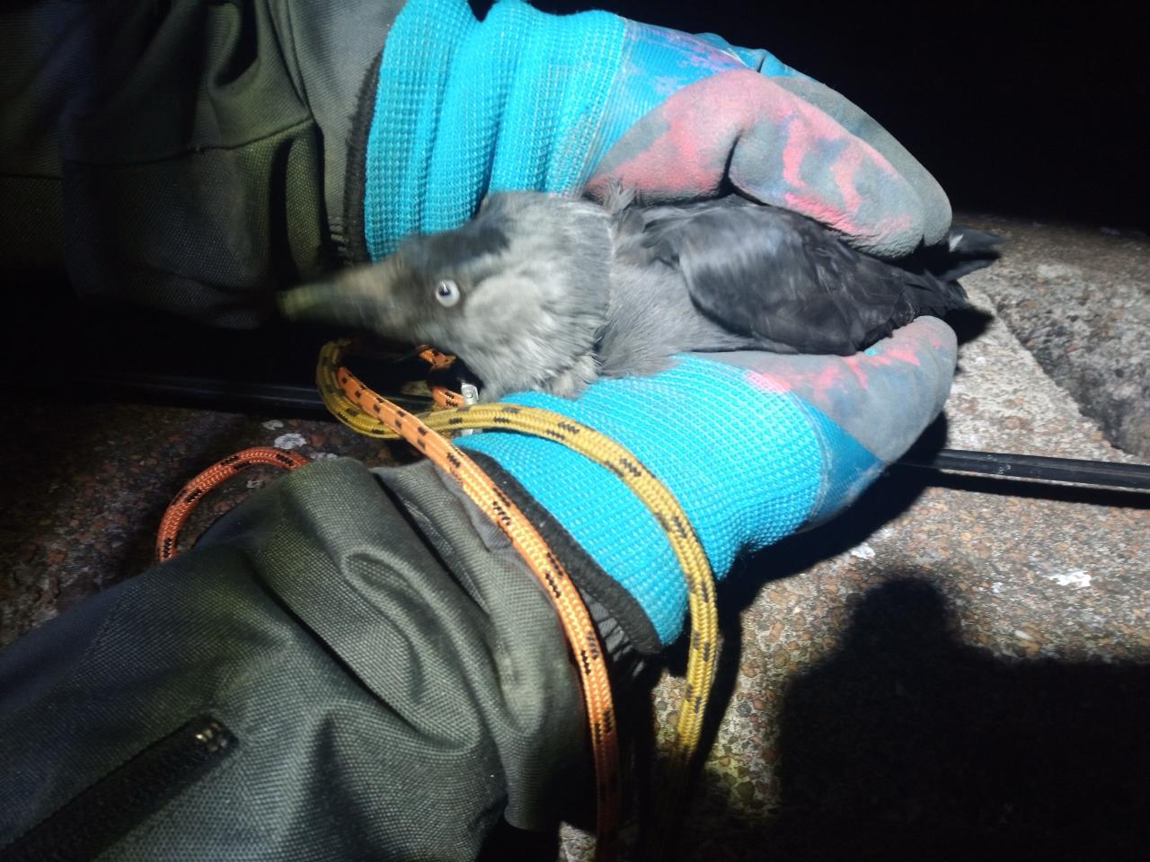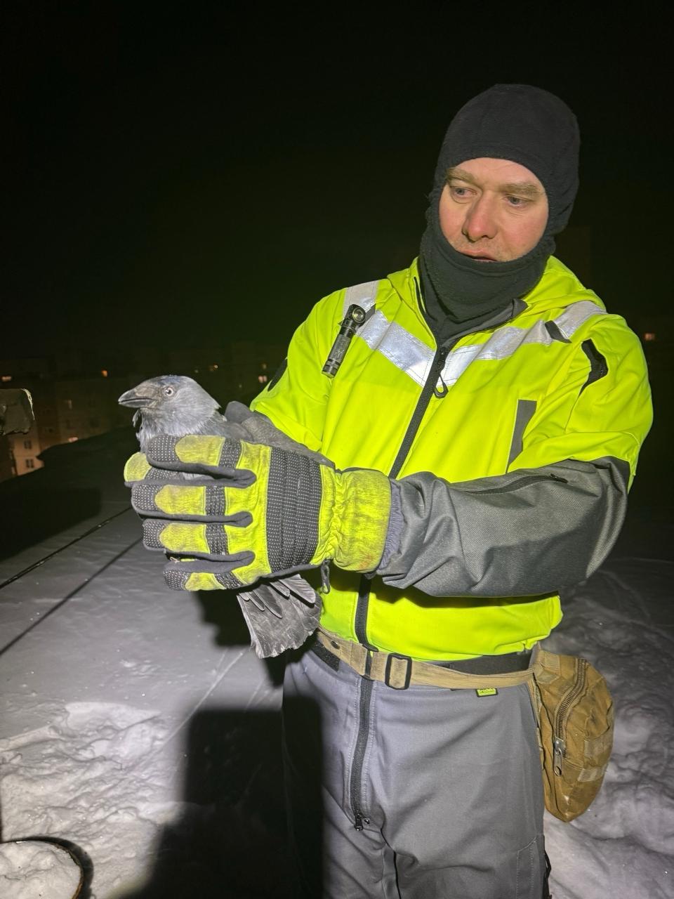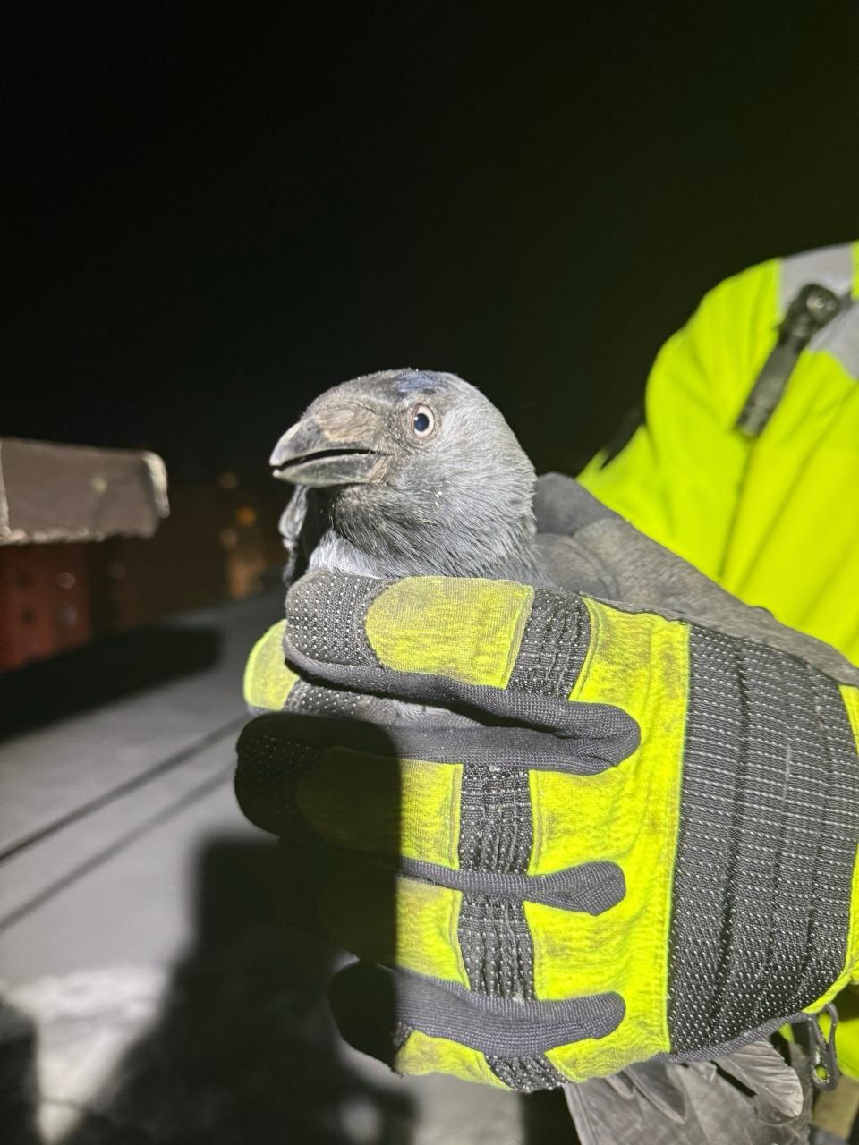 Спасатели вышли на крышу дома. С помощью петель, ювелирной точности и терпения они вызволили одну галку. Птица бодро взмахнула крыльями и улетела в ночь, не поблагодарив спасателей. Через десять минут на волю отправилась и вторая птица.
