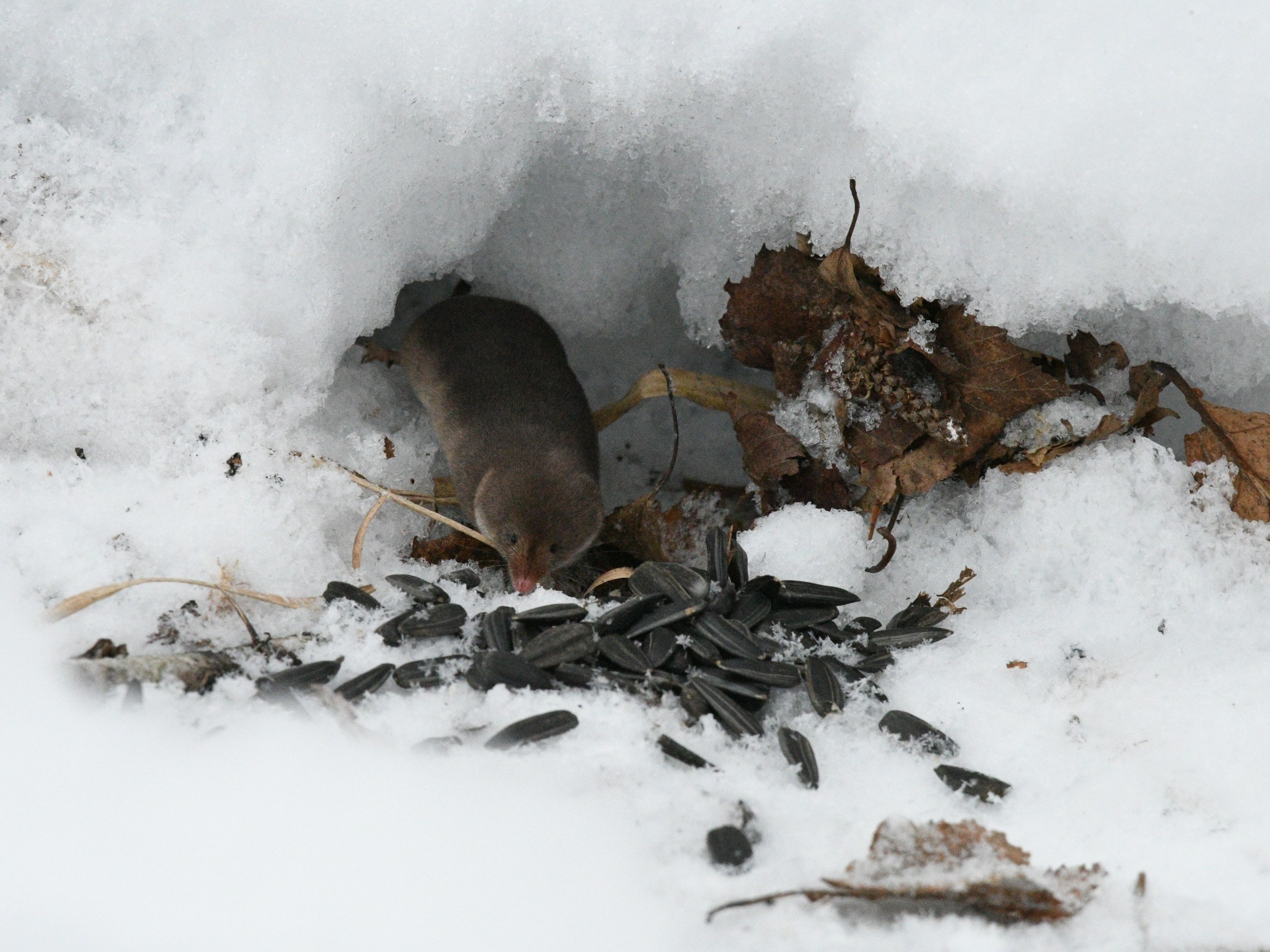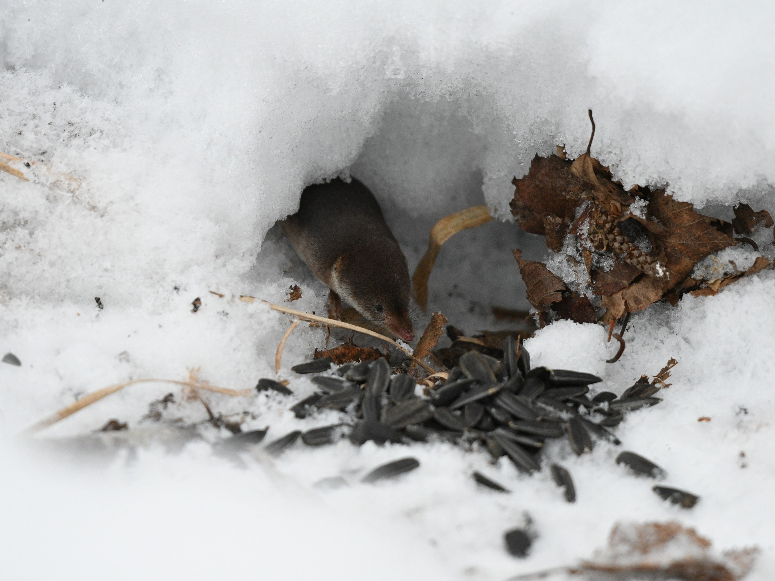 Юркий и опасливый зверек настороженно прятался в снегу, не желая попадать под прицел страшной фотокамеры. Чтобы приманить модель для съемки пришлось подготовить подношение - семечки.