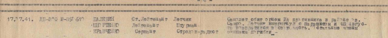 Выяснилось, что самолет ДБ-3ф был сбит огнем истребителей. Летчик Василий Алексеевич Балебин выпрыгнул с парашютом и вернулся в свою часть. Штурман Алексей Иванович Шпортенко и стрелок-радист Евгений Емельянович Кравченко погибли.