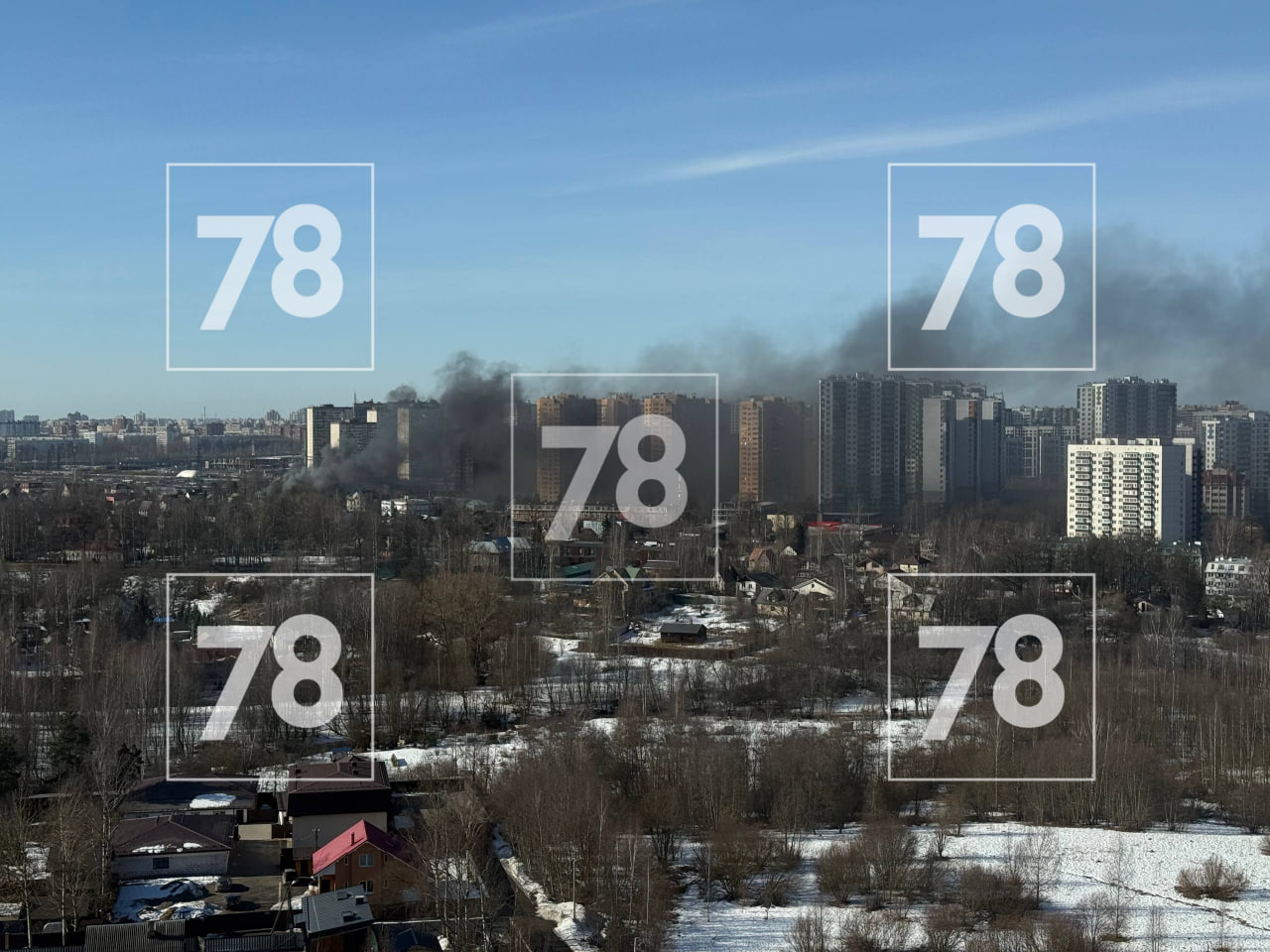 Огромные клубы чёрного дыма поднимаются над Мурино в районе привокзальной площади, об этом сообщают очевидцы в социальных сетях