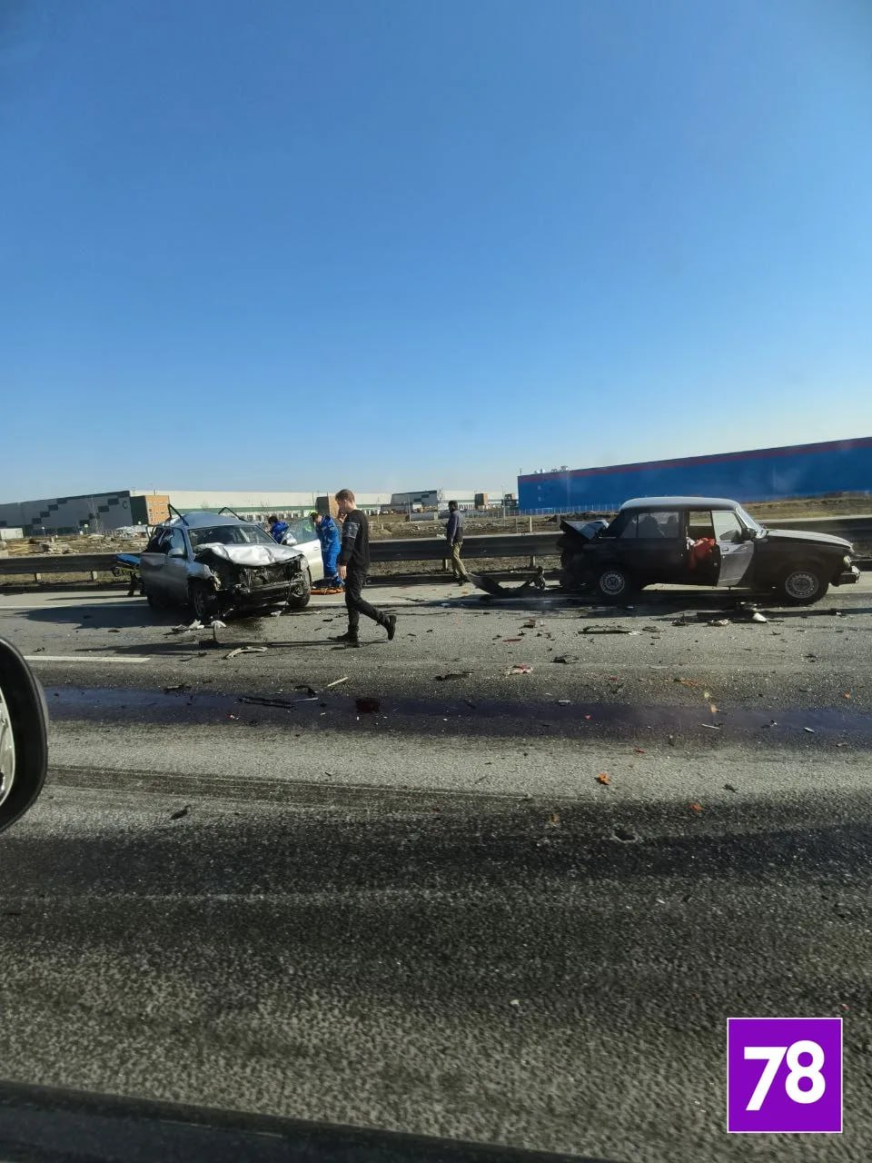 На 26-м километре, перед съездом на проспект Энгельса, жёстко столкнулись две легковушки, также задело фуру — на фото. Ещё одно ДТП произошло ближе к Мурино, возле съезда на проспект Культуры.
