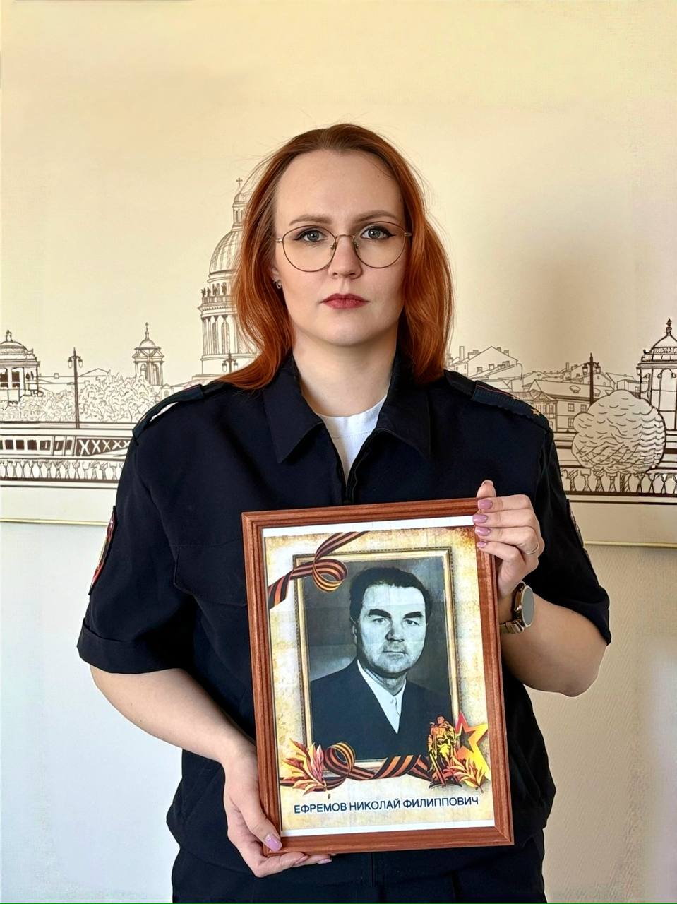 «Моему дедушке, Ефремову Николаю Филипповичу, на момент начала Великой Отечественной войны исполнилось 16 лет. На фронт его не взяли, но в стороне он, как и многие юноши того времени, остаться не мог и вступил в партизанское движение Псковской области, где оставался до самого конца войны», - рассказала инспектор отдела кадров УМВД России по Адмиралтейскому району Евгения Герасимова.